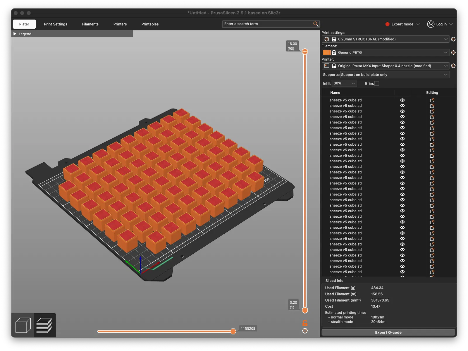 Cả hai cách đều tốn nhiều vật liệu. Trong ảnh, lưu ý một bàn in kích thước MK4 với 76 khối lập phương — bằng một nửa số lượng bạn cần. Nếu in với 80% độ đặc ruột, bàn in này sử dụng chưa đến nửa cuộn sợi PLA; do đó, đây là một sự thỏa hiệp tốt. Tất nhiên, bạn có thể in chúng với độ đặc ruột thấp hơn nếu bạn chỉ muốn có vẻ ngoài, nhưng tôi nghi ngờ Duchamp sẽ ghét điều đó.