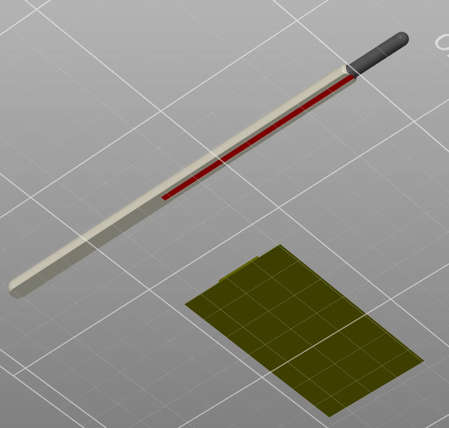 NHIỆT KẾ | Ống nhiệt kế có một chỗ lõm nhỏ ở dưới cùng, bạn có thể sử dụng để tạo bản in đa vật liệu. Trong ảnh, lưu ý cách tôi đã sơn vật liệu để biểu thị thủy tinh (sợi PLA trong suốt), kim loại (màu xám hoặc bạc) và thủy ngân (màu đỏ). In đặc bộ phận này để có độ rõ tương đối.