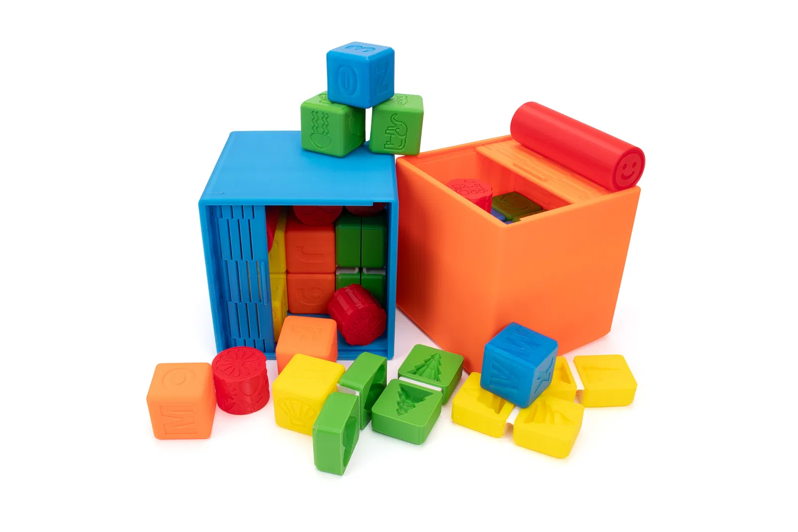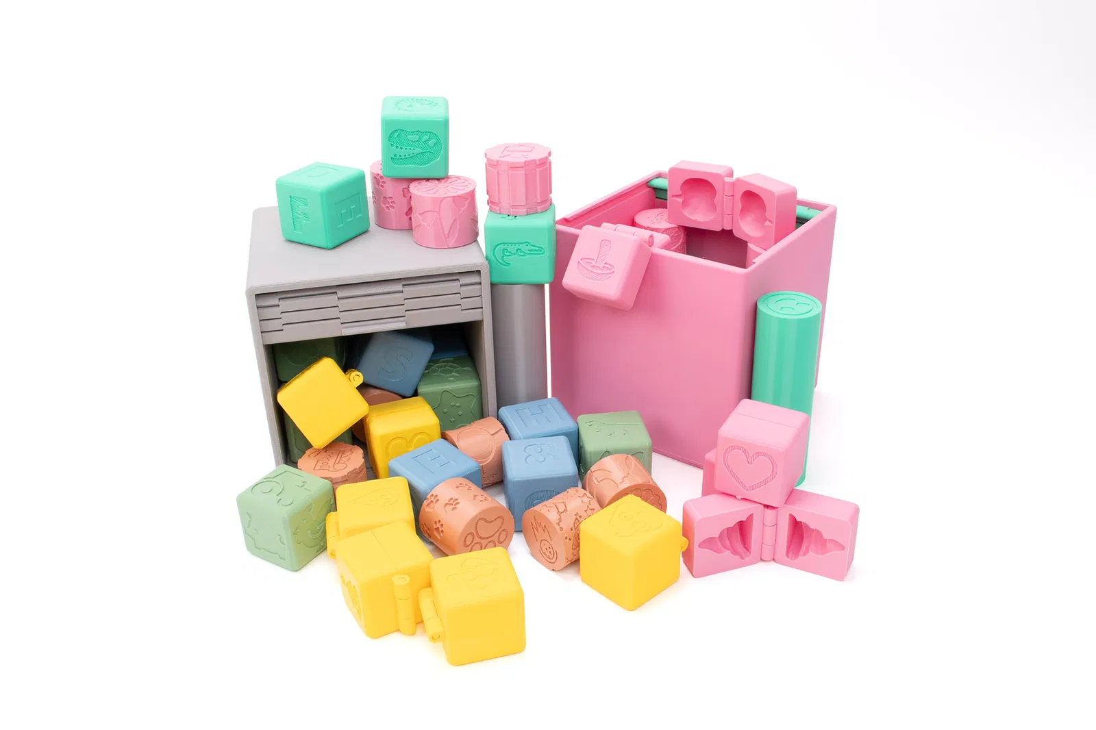 Mấy cái khối đóng dấu này có kích thước 4x4x4 cm. Mỗi khối có 6 hình khác nhau để bạn có thể đóng dấu vào bột nặn hoặc cát động. Khối này giúp phát triển kỹ năng vận động tinh, vốn từ vựng (kể chuyện) và trí tưởng tượng.