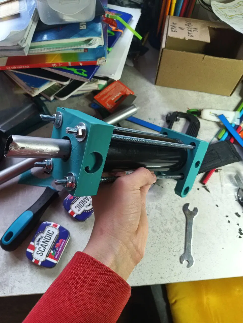Một xi-lanh khí nén không có bộ phận bằng sắt. Cần thêm ống 5cm, ống 3cm, 8 đai ốc M8, thanh ren M8, cao su, keo siêu dính và chất bôi trơn.