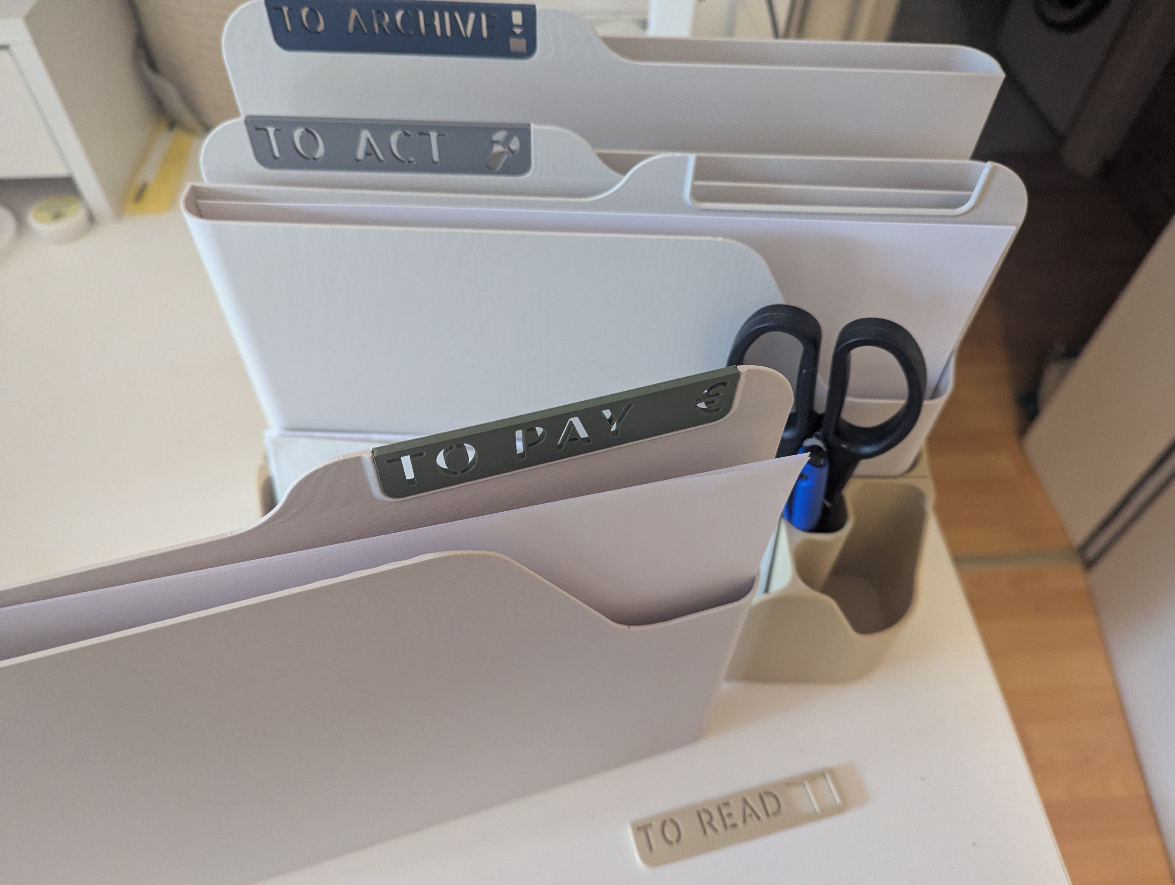 Phân loại và sắp xếp: Khi có thời gian, hãy phân loại chúng theo chủ đề vào bốn thư mục bền chắc được dán nhãn Lưu trữ (Archive), Thanh toán (Pay), Hành động (Act) và Đọc (Read). Mỗi thư mục chứa vừa tài liệu A4, bao gồm cả phong bì, và giữ cho giấy tờ của bạn được bảo vệ.