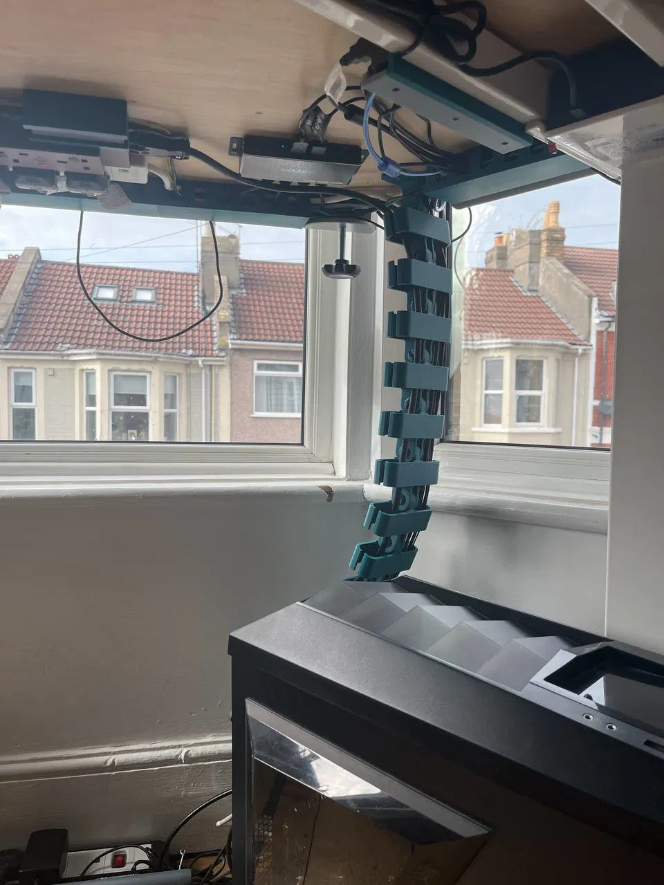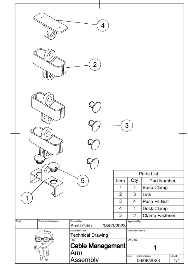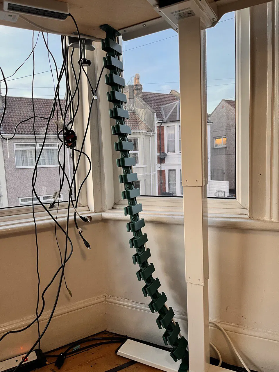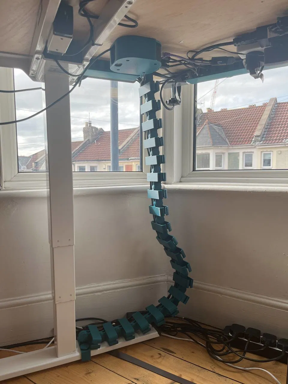 Nhiều bàn làm việc đứng gặp vấn đề quản lý dây cáp kém vì tất cả dây cáp phải dài gấp đôi để hỗ trợ bàn di chuyển lên xuống. Ban đầu, tôi đã dùng một số ống quản lý cáp để bó các dây lại với nhau, tuy nhiên, điều này chỉ có nghĩa là thay vì có rất nhiều dây lòng thòng và bị vướng, tôi chỉ có một vài sợi dây rất dày. Điều này gây ra nhiều vấn đề khi dây bị kẹt và làm bật thiết bị ra, có khả năng gây hư hỏng. Cuối cùng, tôi quyết định in một cánh tay quản lý cáp được gắn vào bàn và cho phép dây di chuyển theo một cách nhất định. Chân bàn đứng tôi sử dụng được liên kết bên dưới: