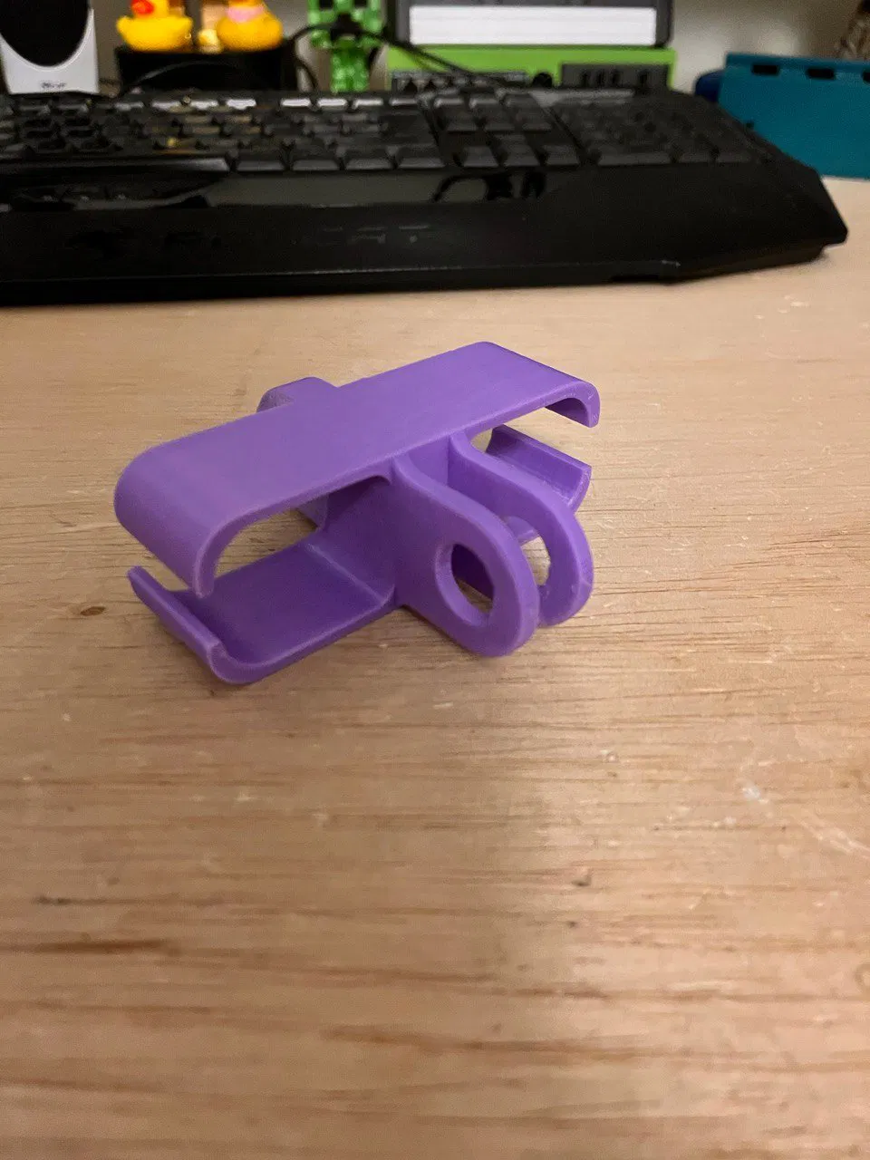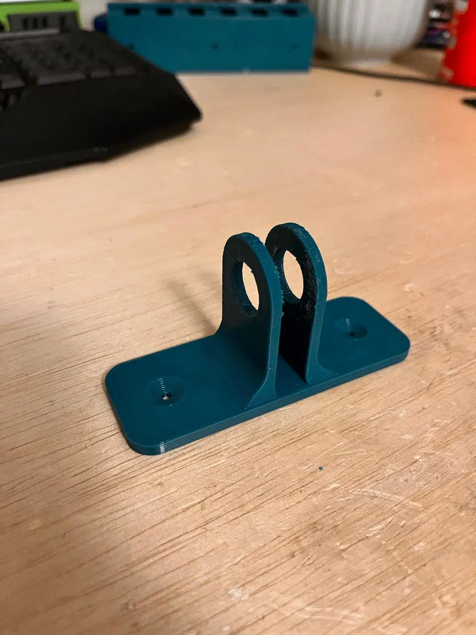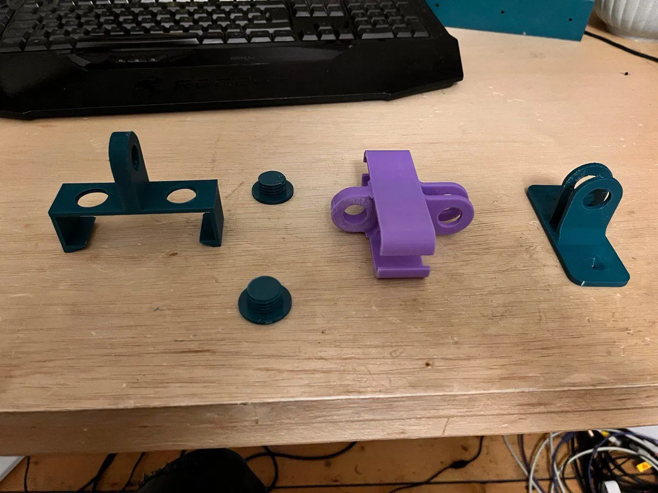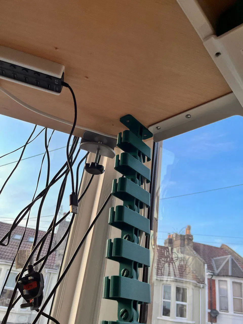 Nhiều bàn làm việc đứng gặp vấn đề quản lý dây cáp kém vì tất cả dây cáp phải dài gấp đôi để hỗ trợ bàn di chuyển lên xuống. Ban đầu, tôi đã dùng một số ống quản lý cáp để bó các dây lại với nhau, tuy nhiên, điều này chỉ có nghĩa là thay vì có rất nhiều dây lòng thòng và bị vướng, tôi chỉ có một vài sợi dây rất dày. Điều này gây ra nhiều vấn đề khi dây bị kẹt và làm bật thiết bị ra, có khả năng gây hư hỏng. Cuối cùng, tôi quyết định in một cánh tay quản lý cáp được gắn vào bàn và cho phép dây di chuyển theo một cách nhất định. Chân bàn đứng tôi sử dụng được liên kết bên dưới: