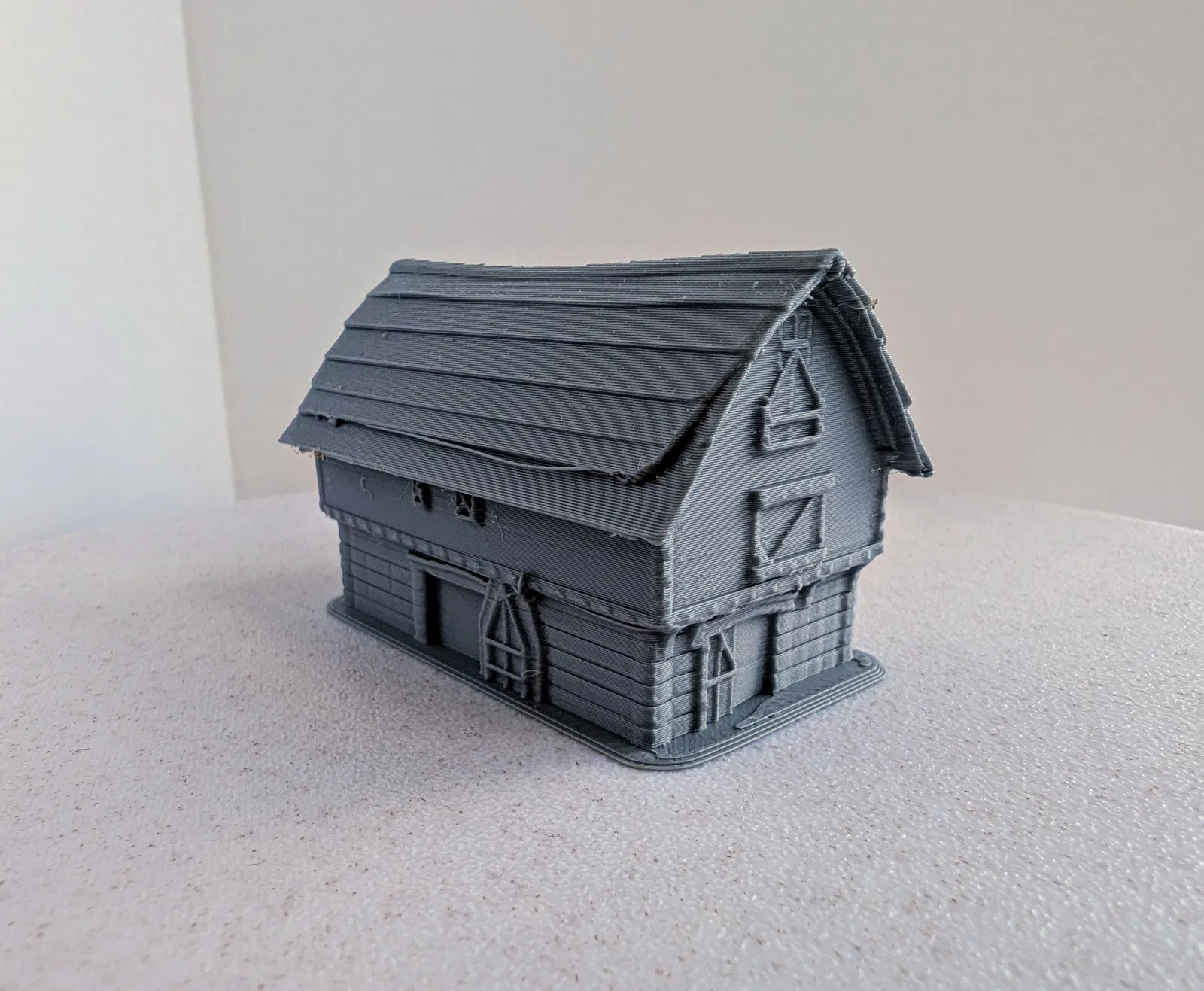 Mô hình nhà kho Trung Cổ độc đáo với mái hiên rộng, vách gỗ mộc mạc và cửa sập trữ rơm. Chi tiết rõ ràng, in đẹp với PLA, phù hợp cho diorama và bối cảnh giả tưởng.