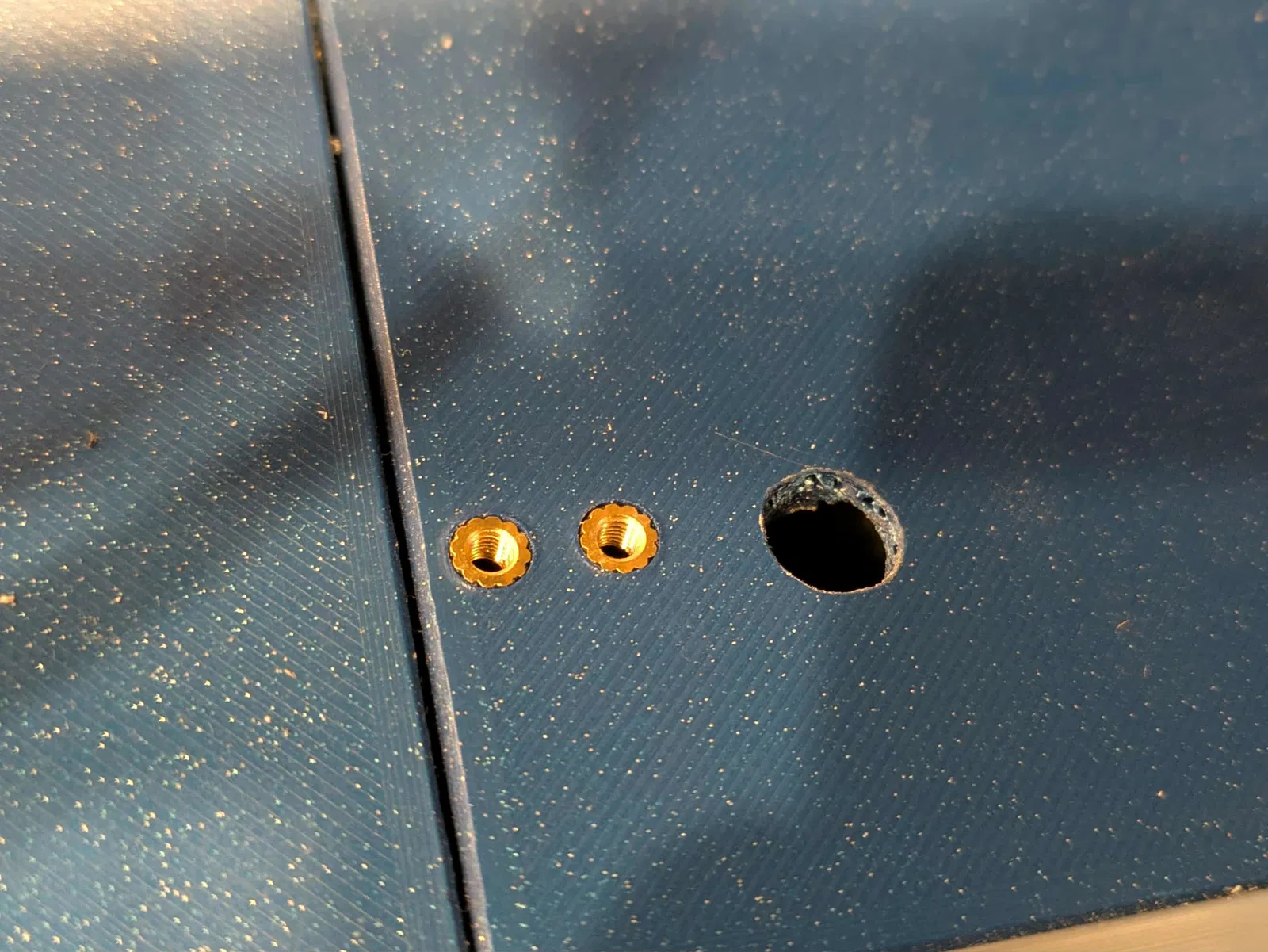 - Lắp các ốc ren nhiệt 5mm vào các lỗ 4.2–4.5mm (phần đáy mỏng, nên cẩn thận) (