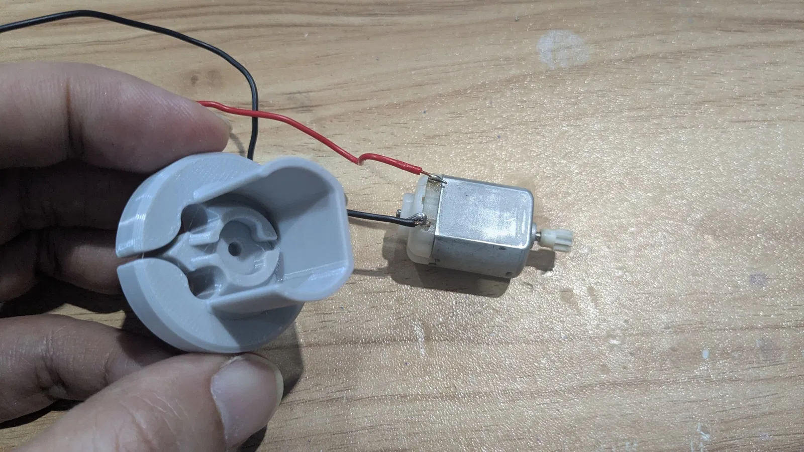 Để lắp phần đế giữ động cơ, bạn cứ kết nối và hàn mọi thứ lại trước nha. Chúng tôi đã thiết kế phần đế có các khe để bạn luồn dây điện vào dễ dàng, vì chúng tôi hay quên là cần phải luồn dây qua trước khi hàn lắm :P