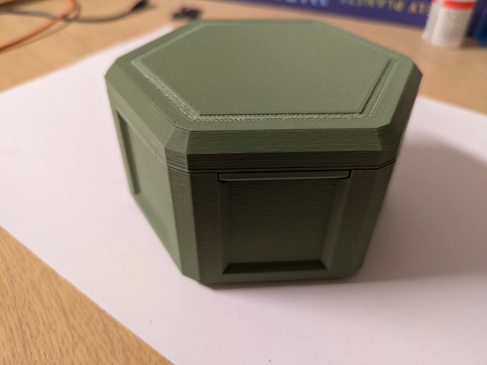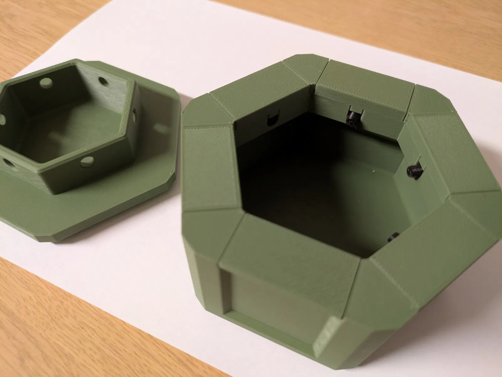 Hộp "Lục giác" bí mật được chỉnh sửa để dễ lắp ráp hơn. Hướng dẫn bao gồm việc dán ốc vào đai ốc M6 và lắp các bộ phận để hoàn thành cơ chế đóng mở.