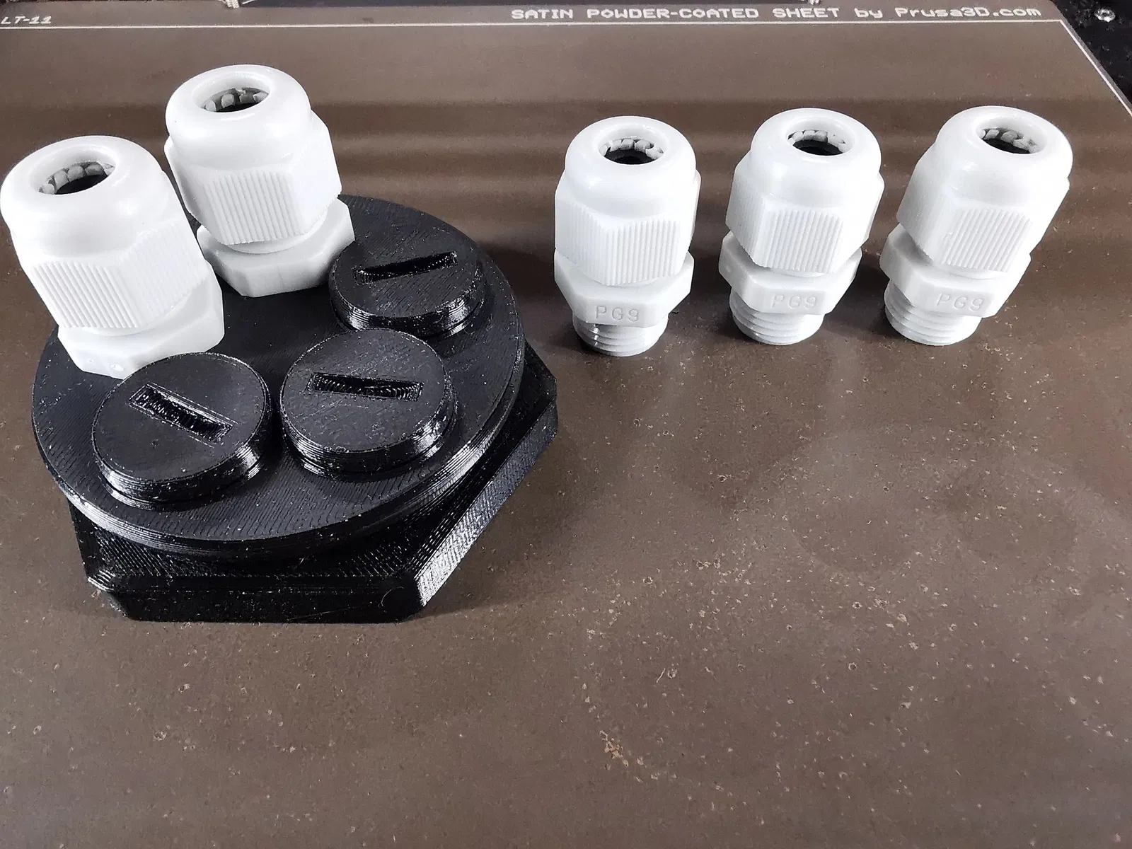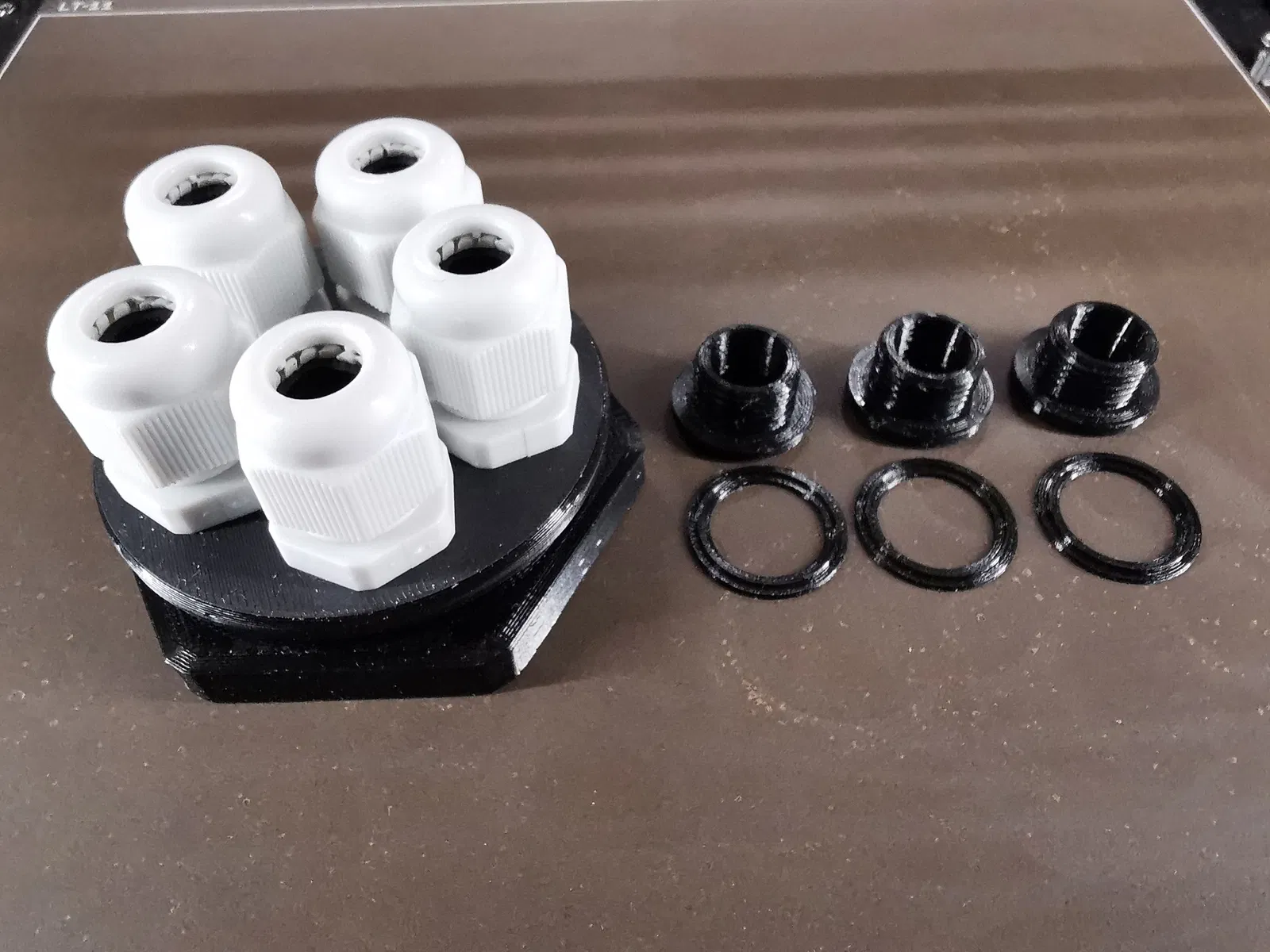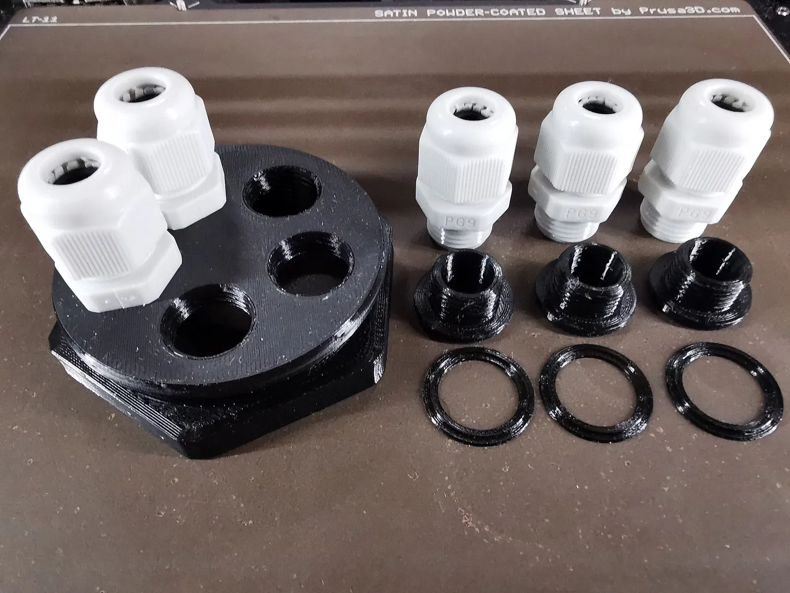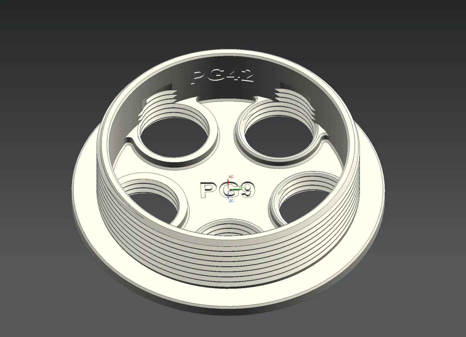 Vật liệu 1x Bộ chuyển đổi PG42 (ren PG42) [PG42_BlindStuffing_PGthread_to_5xPG9_PGthread_v00.stl] 1x Đai ốc nút chặn PG42 (ren PG42) [PG42_Nut_PGthread_v00.stl hoặc [PG42_Nut_PGthread_v10.stl] (1-5)x Đầu nối cáp PG9 (ren PG9) [xem liên kết] (4-0)x Nút chặn PG9 [PG9_BlindStuffing_PGthread_v01_slim.stl] (4-0)x Vòng đệm TPU PG9 (tùy chọn) [PG9_TPU-Sealing_v00_slim.stl]