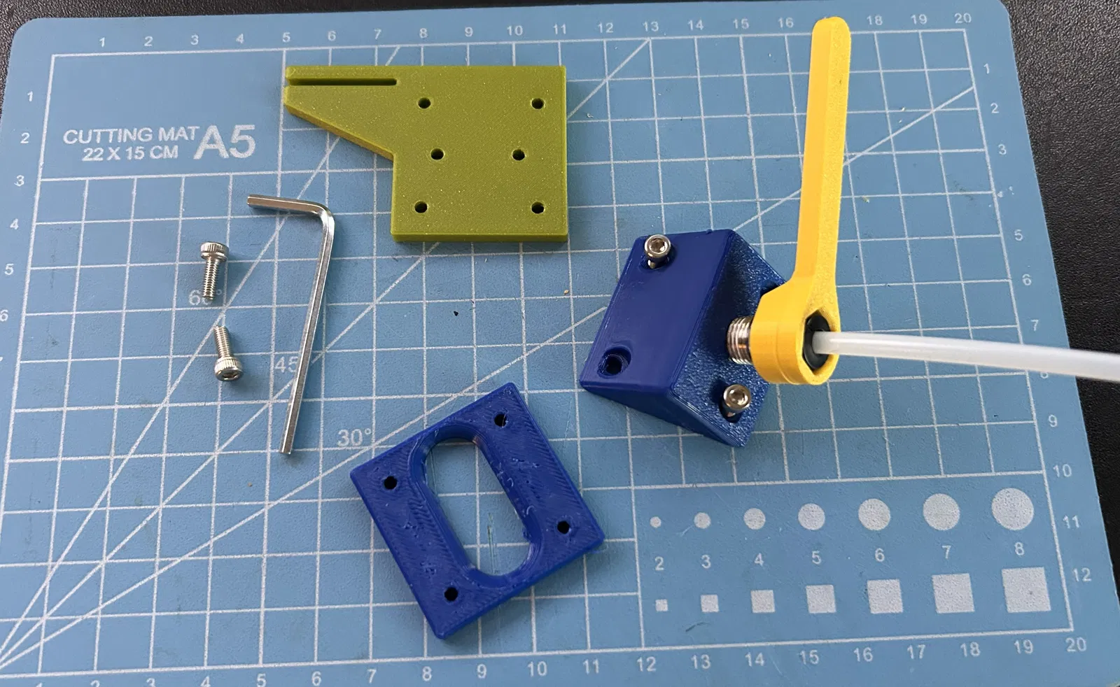 Lắp ráp thì chỉ cần khoan lỗ và làm sạch khu vực phù hợp cho ống PTFE (tui lấy cái tấm góc ra làm mẫu nha), dùng 4 con vít lục giác M3-8 siết thẳng vô cái tấm góc ra đó.