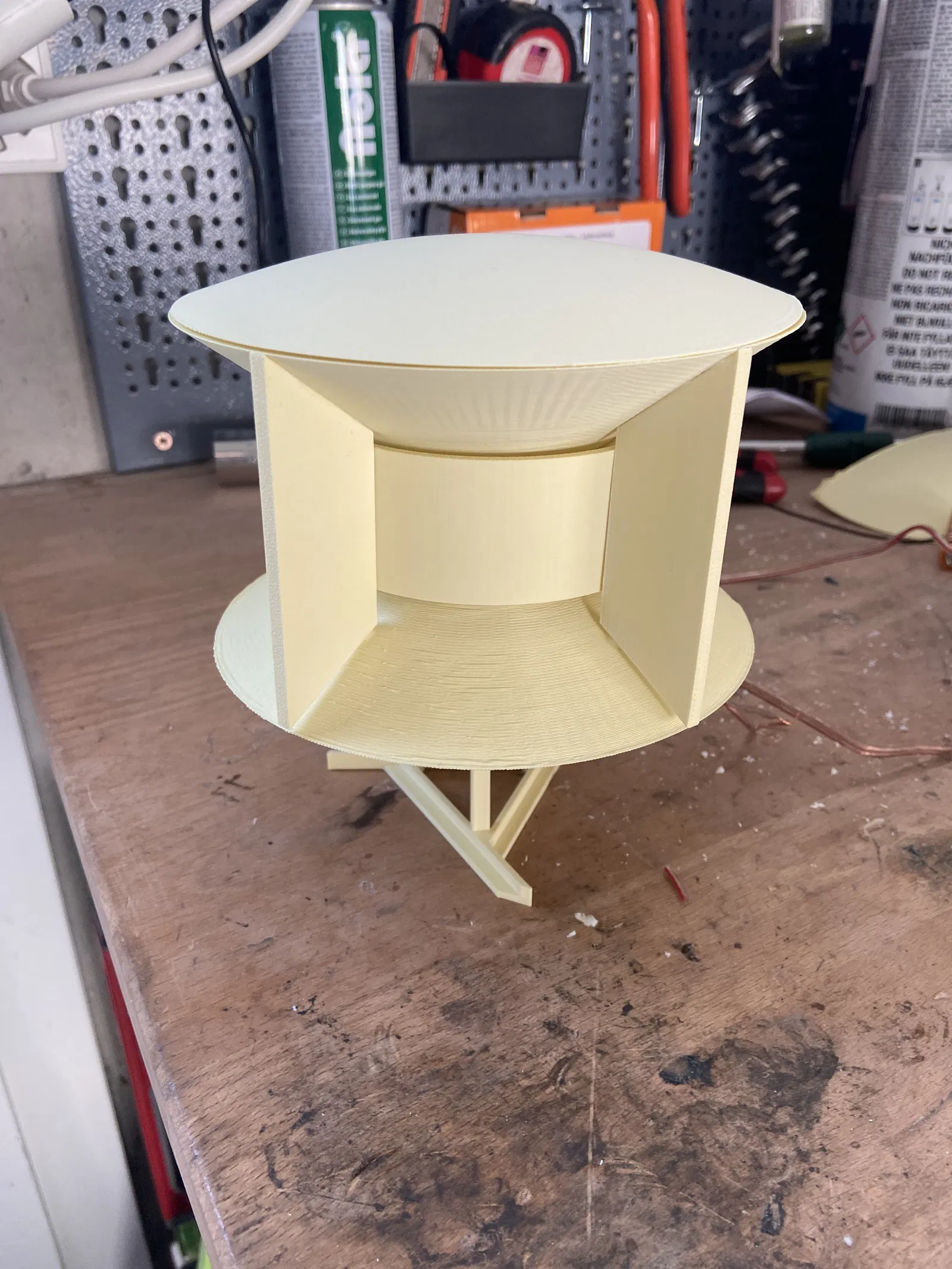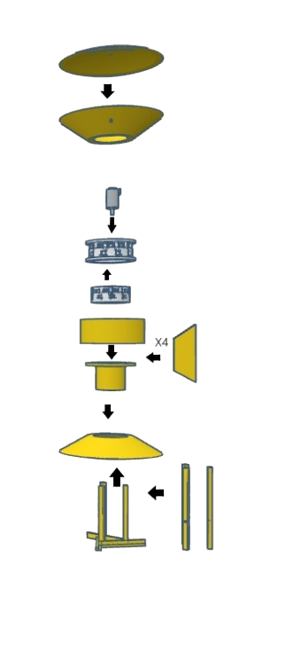 Đầu tiên, bạn phải dán các bộ phận làm lệch hướng vào bộ phận chiếu xạ phía trên. Sau đó gắn tấm chắn và bây giờ bạn có thể dán stato cùng với động cơ và cánh quạt vào bộ phận chiếu xạ phía trên. Bây giờ bạn có thể dán bộ phận hút vào stato và dán toàn bộ cấu trúc vào bộ phận chiếu xạ phía dưới. Cuối cùng, khi mọi thứ đã được dán lại với nhau, bạn có thể dán chân đế tùy chọn. Nếu bạn muốn chân đế dạng cột, bạn sẽ cần 3 con vít M3 để dán nó vào một cột.