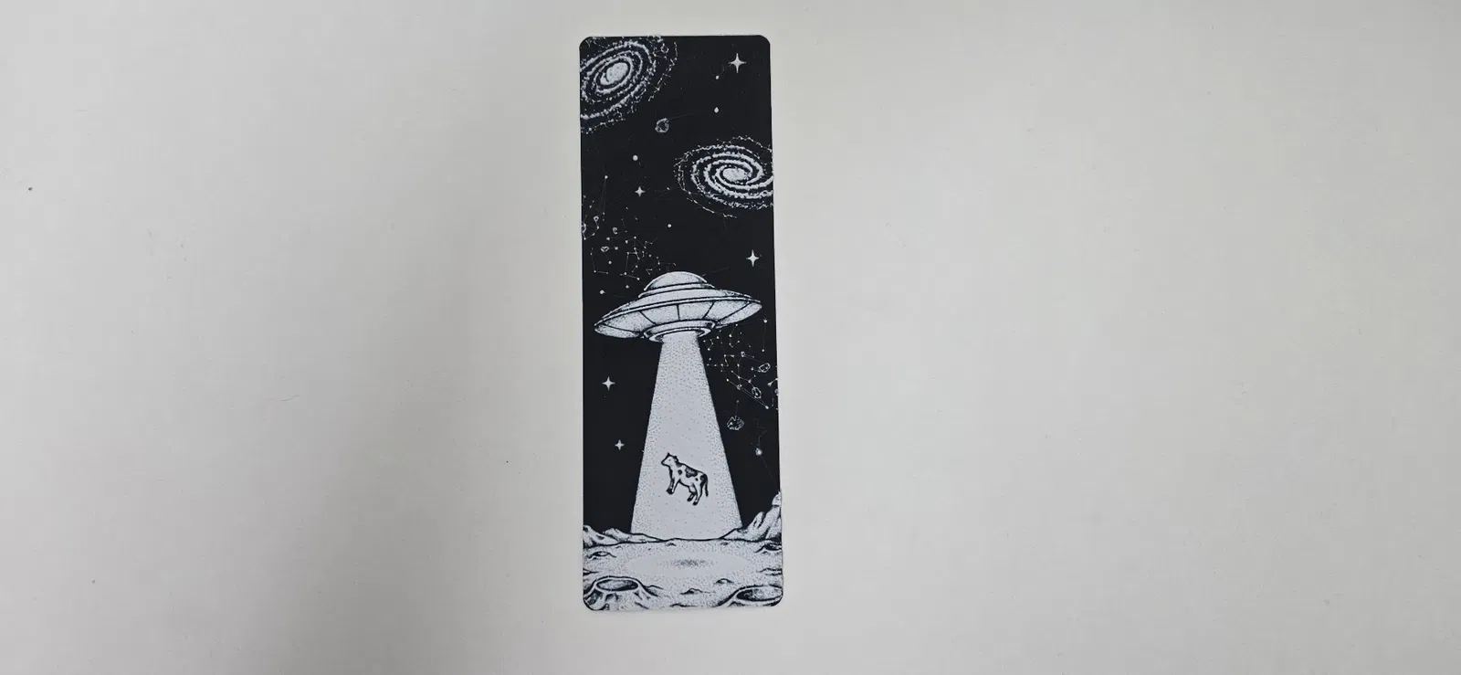 Một cái kẹp sách độc đáo lấy cảm hứng từ UFO bắt cóc bò, mang phong cách không gian vũ trụ hài hước. Hoàn hảo cho những người yêu thích bí ẩn, người ngoài hành tinh và bò!