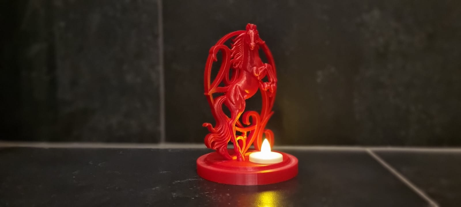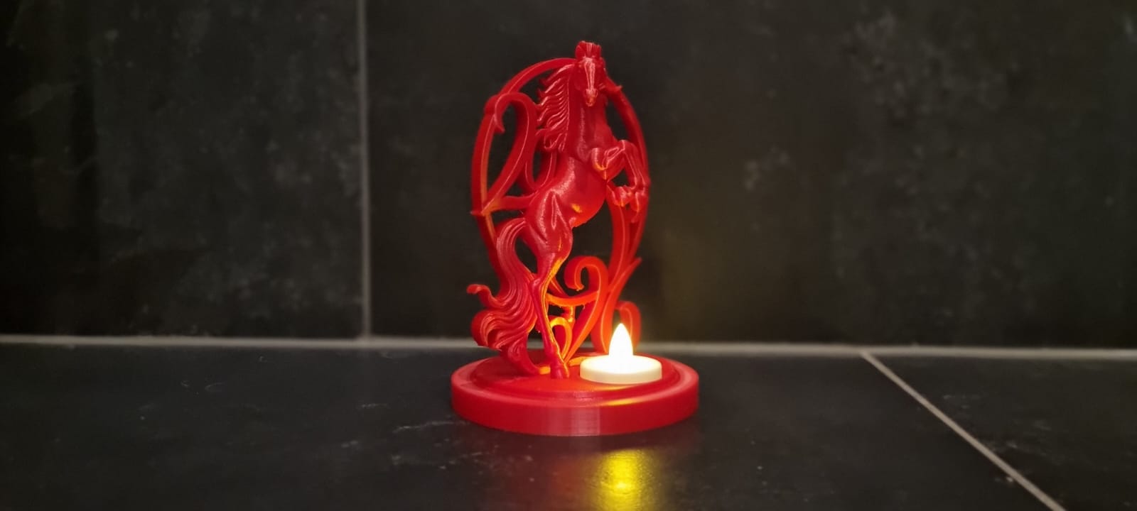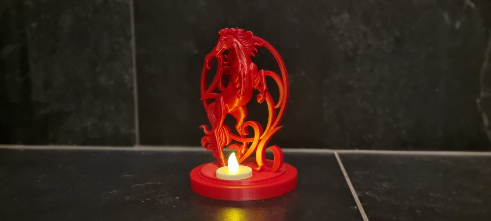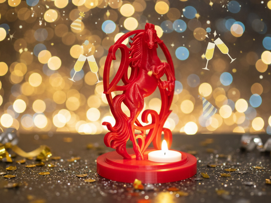 ngựa, tượng trưng cho sức mạnh và sự khởi đầu mới. Nó được đặt trên một đế màu đỏ phù hợp, cùng với một đèn nến trà nhỏ màu trắng đang tỏa sáng, mang đến một ngọn lửa ấm áp, thân mật.