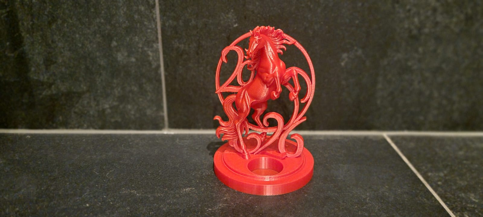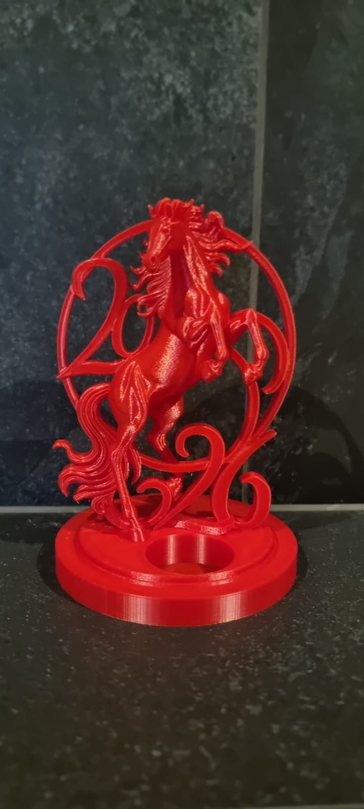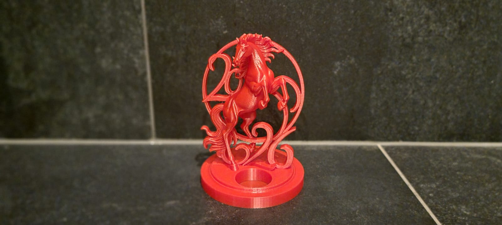 ngựa, tượng trưng cho sức mạnh và sự khởi đầu mới. Nó được đặt trên một đế màu đỏ phù hợp, cùng với một đèn nến trà nhỏ màu trắng đang tỏa sáng, mang đến một ngọn lửa ấm áp, thân mật.