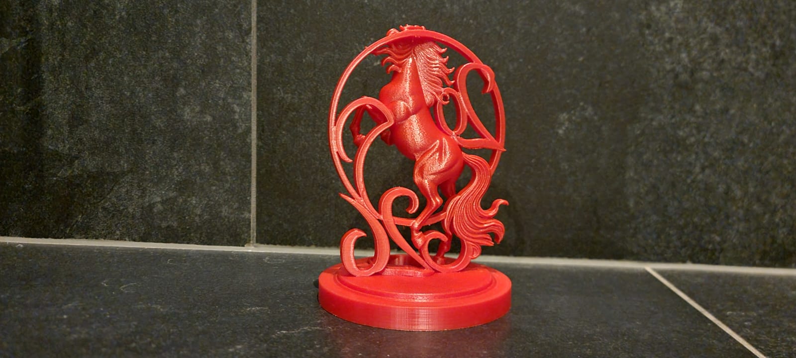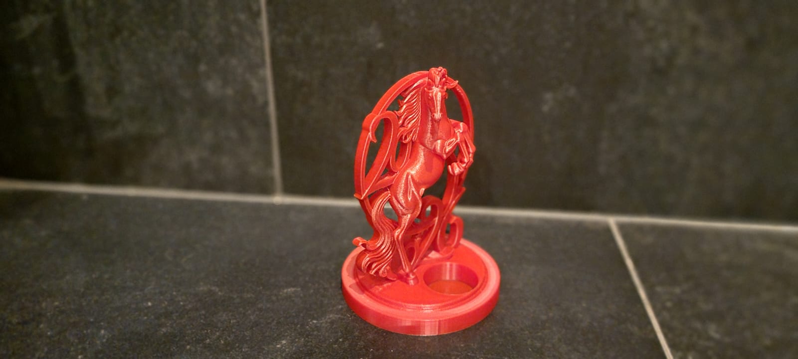 Mô hình trang trí ngựa đón giao thừa với các tùy chỉnh in ấn: lớp dày 0.16mm, 2 lớp tường, 15% mật độ ruột. Hỗ trợ 3 lớp brim tự động với chiều rộng 16mm.