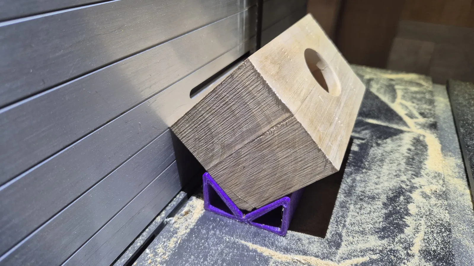Tôi đã in cái bộ phận hỗ trợ cắt đơn giản này cho mấy miếng gỗ vuông của mình. Nó giúp tôi cắt các góc của mấy miếng gỗ đó bằng máy cưa lọng, giúp việc tiện gỗ nhanh và dễ hơn.