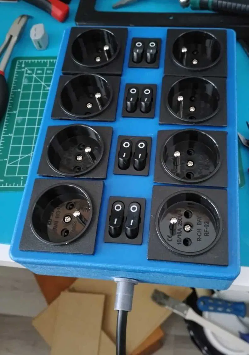 Hộp đựng 8 ổ cắm 230V, có thể bật tắt bằng công tắc. Phù hợp cho nhiều ứng dụng điện dân dụng, giúp bạn quản lý nguồn điện dễ dàng và an toàn hơn. Thiết kế tối ưu cho in 3D với các vật liệu phổ biến như PETG.