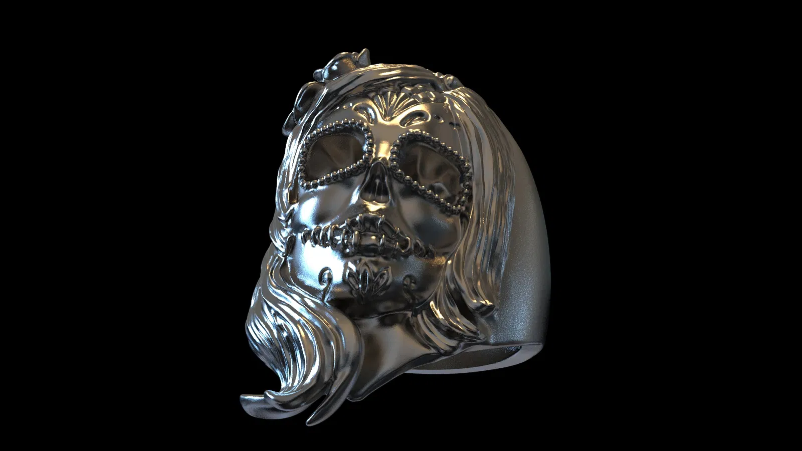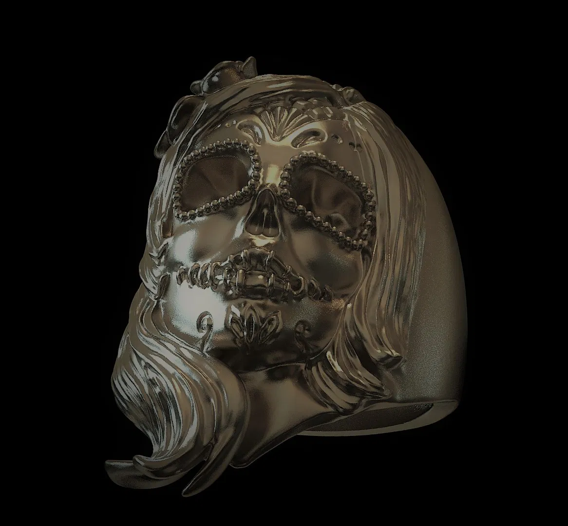 Tải về mẫu OBJ 3D miễn phí nhẫn hình cô gái đầu lâu đường (Sugar Skull Girl) ngày Lễ hội Người Chết, lấy cảm hứng Catrina. Hoàn hảo in 3D, chi tiết phức tạp, trang sức độc đáo, thanh lịch. Định dạng OBJ, loại nhẫn/trang sức, phong cách Dia De Los Muertos/Catrina/Sugar Skull Girl.