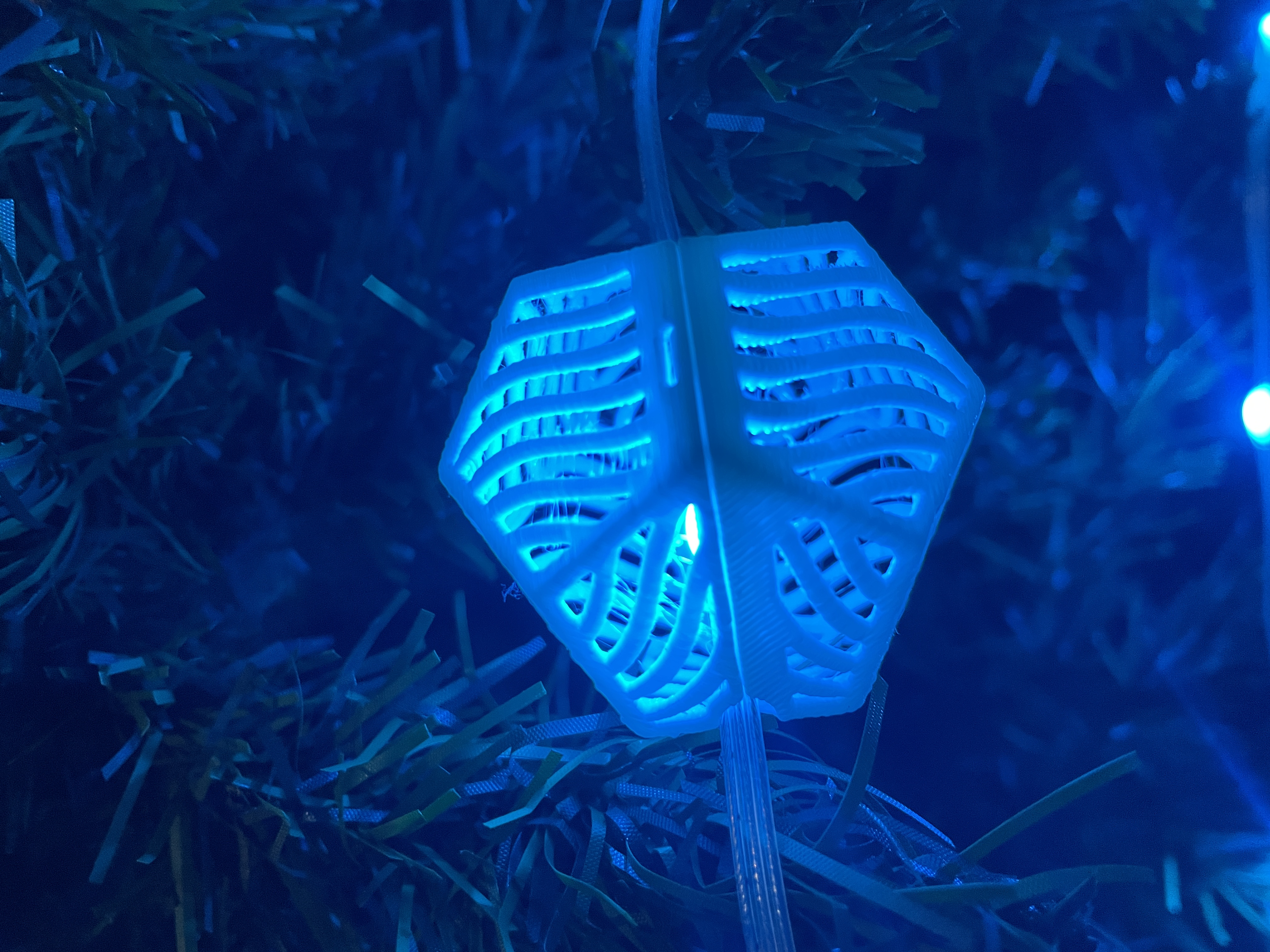 Mô hình là một khối mười hai mặt được chia đôi với bản lề in sẵn, cho phép bạn dễ dàng kẹp nó quanh bóng đèn ngay cả sau khi dây đèn của bạn đã được giăng lên. Nó được cố định bằng cơ chế chốt đơn giản và có một lỗ xuyên qua để cáp chạy gọn gàng qua tâm.