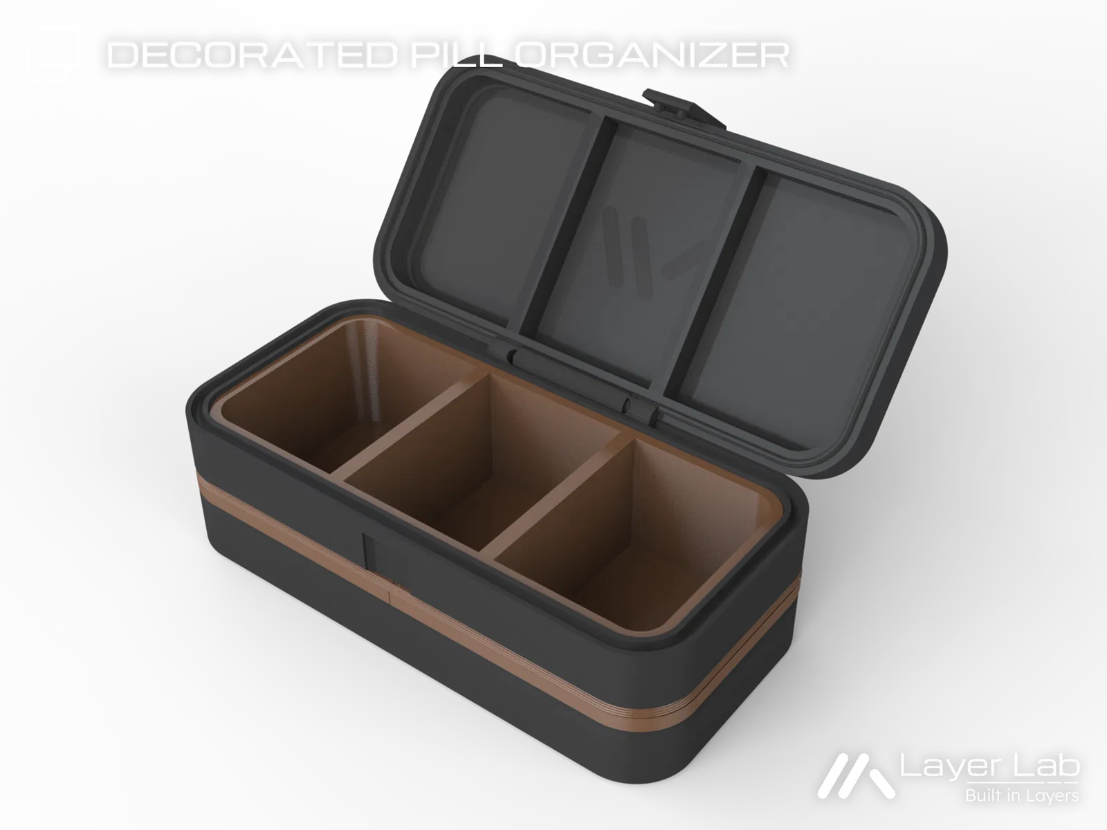Hộp đựng thuốc trang trí với thiết kế in lay, có ba ngăn cho buổi sáng, trưa, tối. Thiết kế này thân thiện với máy in FDM một đầu phun, không cần support. Dễ dàng lắp ráp và tùy chỉnh.
