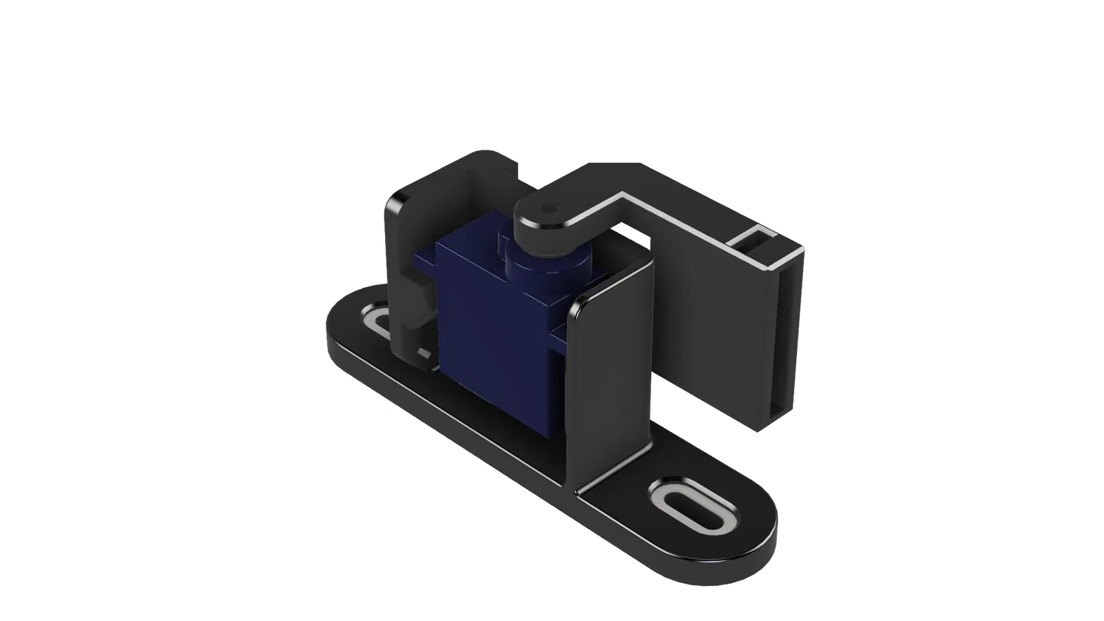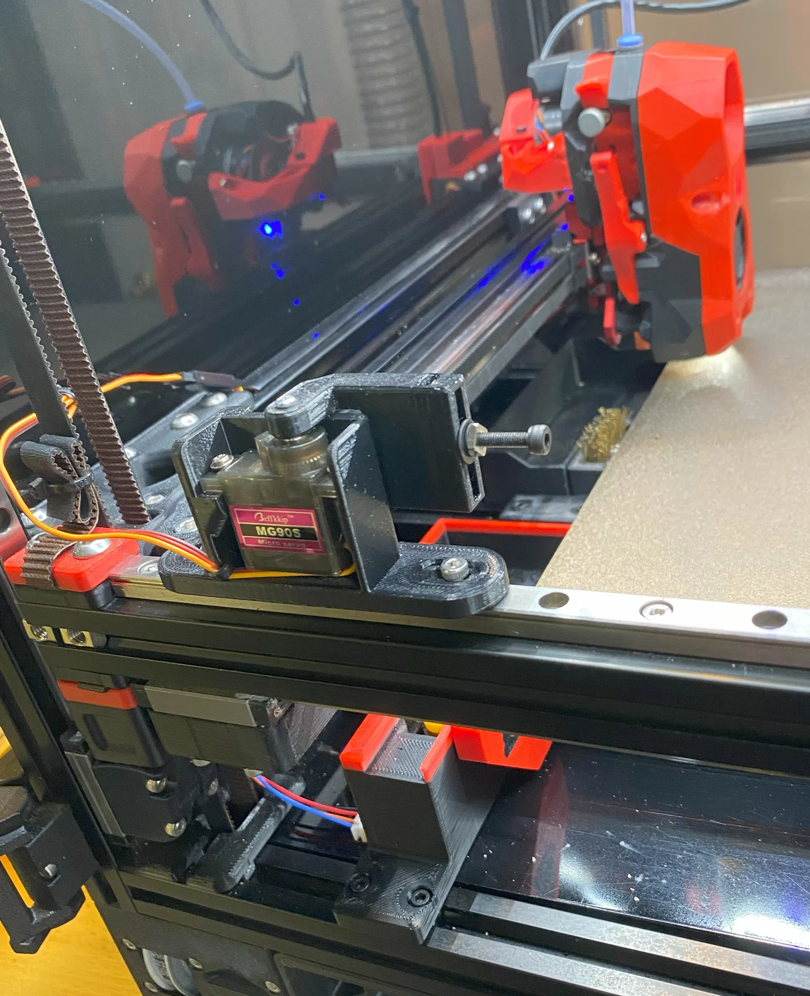 Giá đỡ Servo Khung máy sử dụng một servo phổ biến (MG90S) để xoay bộ phận chặn vào vị trí chỉ khi cần thiết trong chu kỳ cắt sợi. Vào tất cả các thời điểm khác, bộ phận chặn được rút ra khỏi khu vực in.