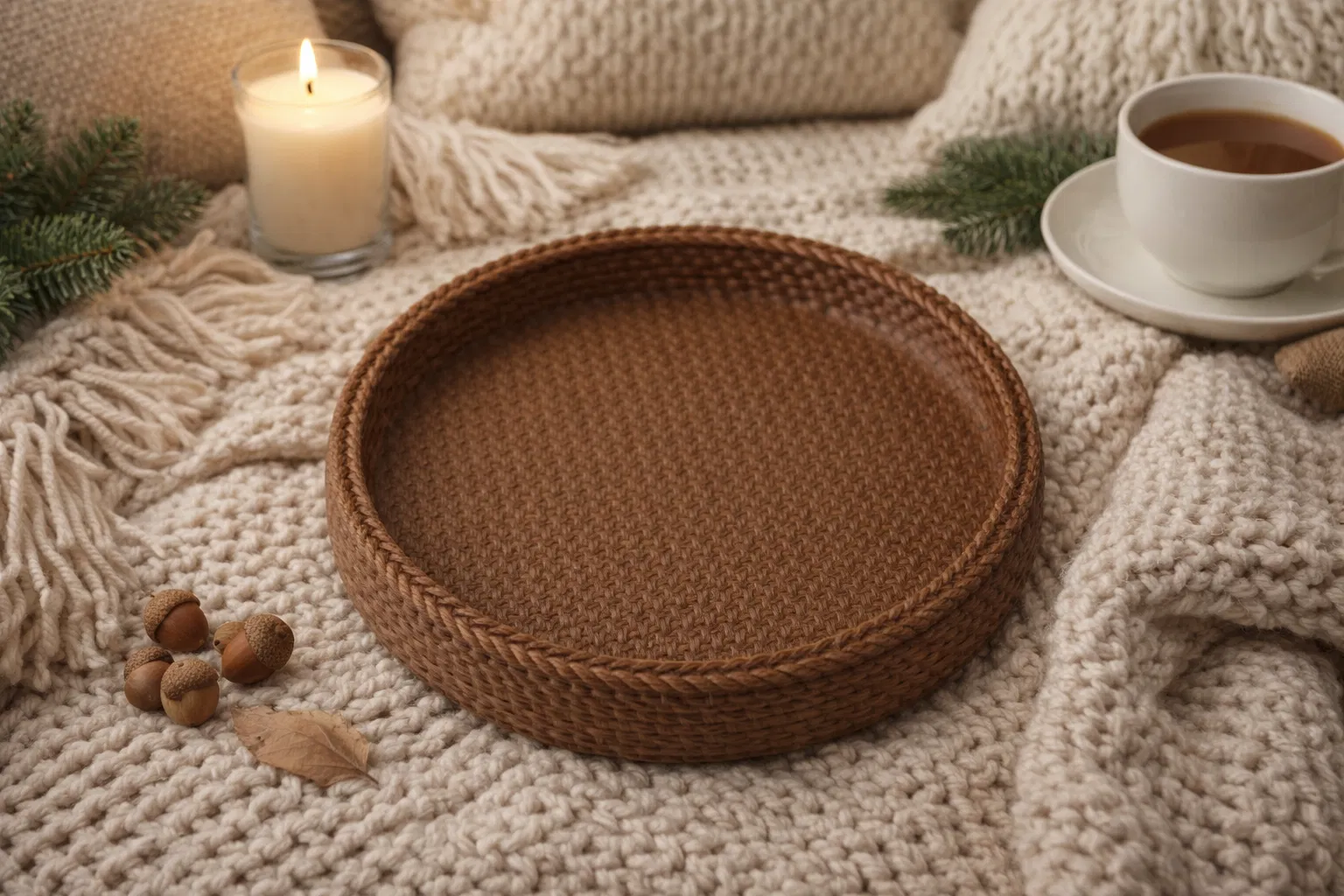 Khay trang trí 3D ấm cúng với hiệu ứng vân đan len độc đáo, màu nâu trầm ấm. Kích thước tròn tiện dụng, viền cao lý tưởng để đựng đồ trang sức, chìa khóa, nến, hoặc các vật dụng nhỏ khác. Hoàn hảo cho phòng khách, bàn cà phê, kệ sách, mang lại cảm giác hygge và nét thủ công hiện đại cho ngôi nhà bạn.