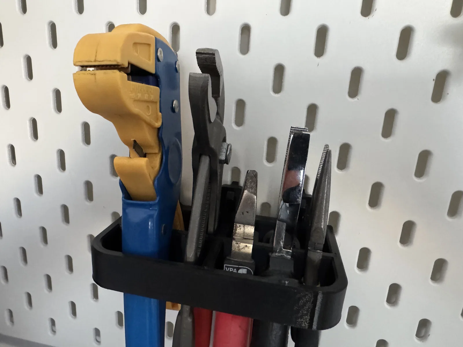 Kệ giữ kềm nhỏ gọn cho bảng treo SKÅDIS của IKEA, giúp giữ nhiều loại kềm và dụng cụ cắt đứng thẳng, dễ nhìn và dễ lấy.