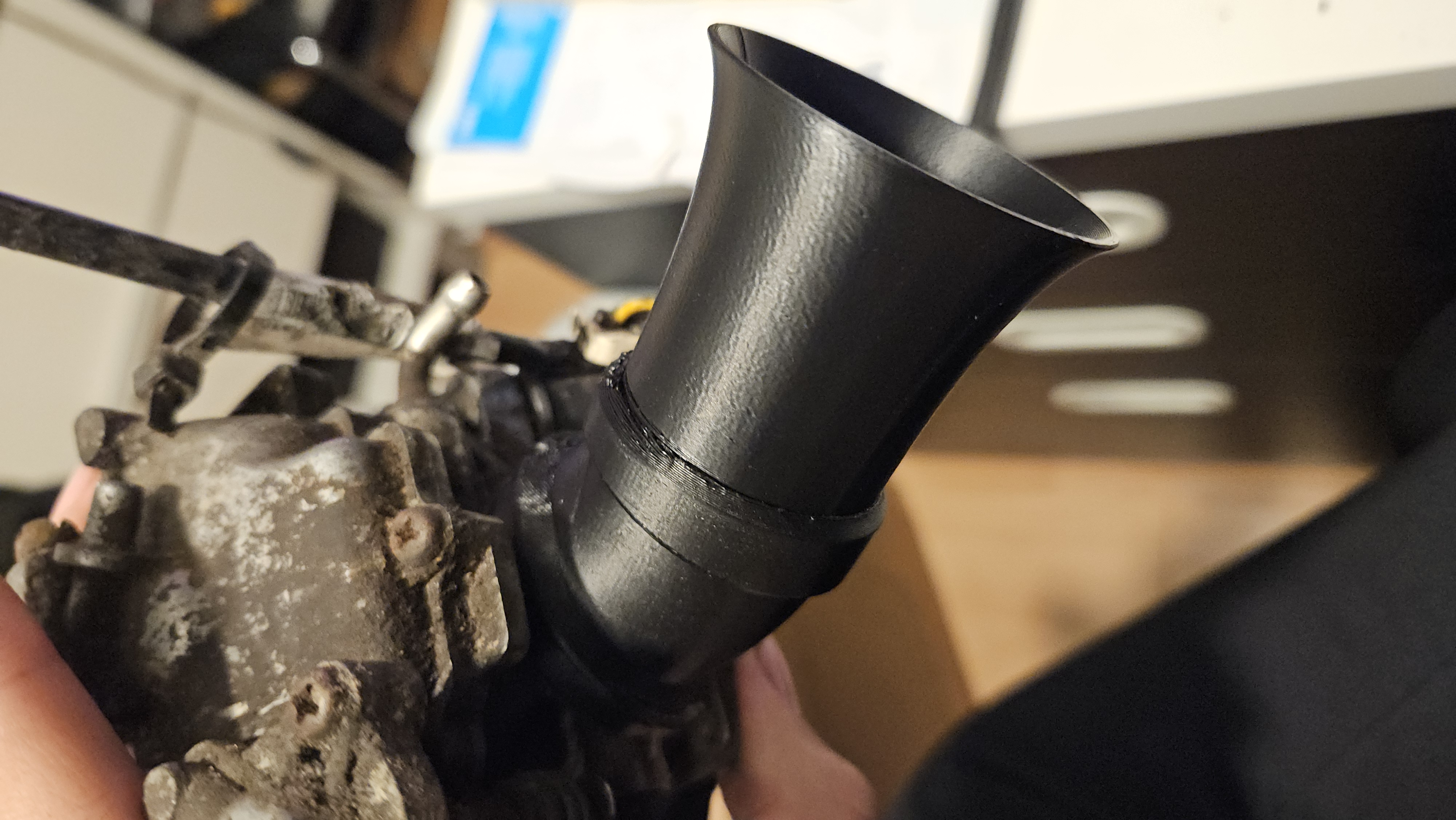 Một cổng hút ngắn dạng loa kèn/ống thông gió cho xe tay ga 50cc (trường hợp của mình là xe Piaggio Fly 50cc 4T), có adapter góc 30 độ để lắp vừa dưới chi tiết ốp nhựa cho kín đáo.