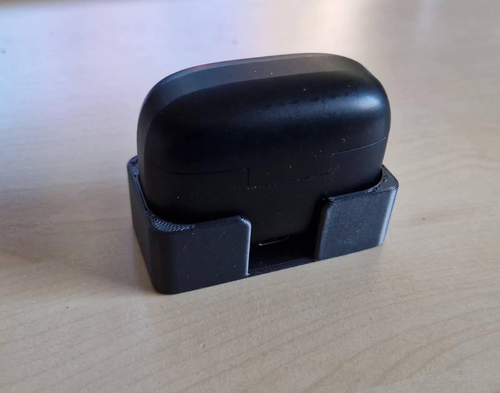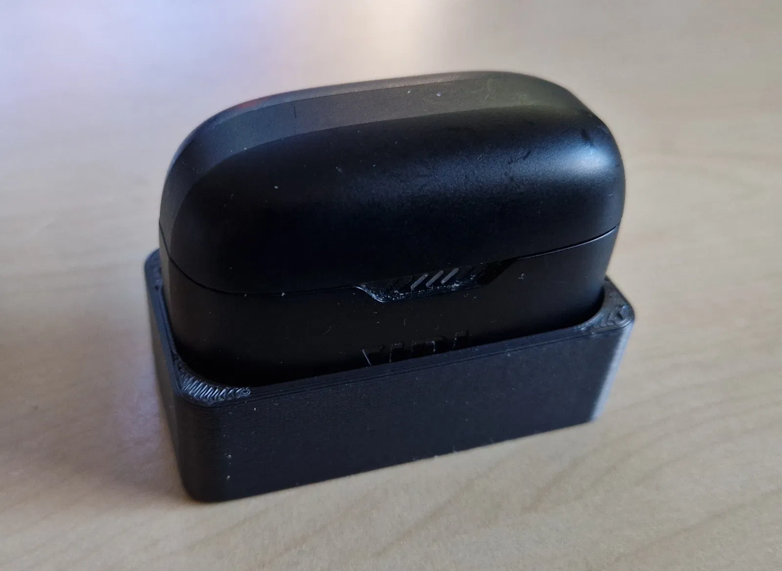 Cái đế này được làm nhanh gọn lẹ để đựng hộp tai nghe JBL. Tui làm cái này là do tui bực mình vụ cái hộp tai nghe JBL á, cứ để lên bàn là nó cứ bị nghiêng qua một bên, làm cho cái tai nghe bị lỏng áp lực với mấy cái chân sạc, thành ra nó sạc hổng có vô.