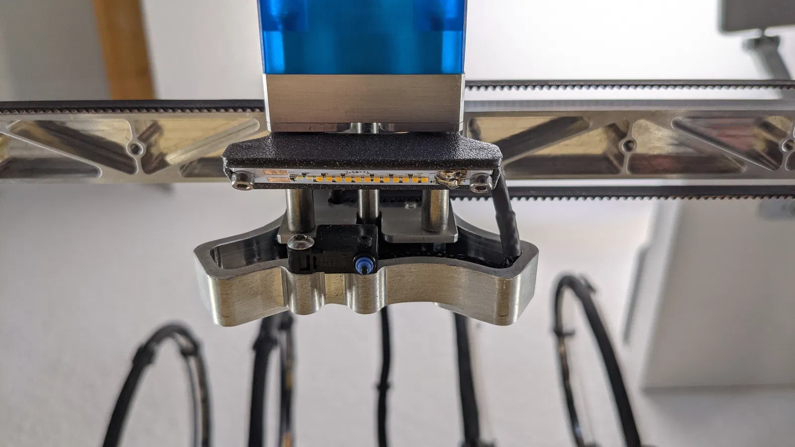 Tui có làm một cái đế nhỏ để gắn dải đèn LED phía dưới đầu máy, để có ánh sáng ngay chỗ tui cần. Bộ phận này in đơn giản, dễ in và có thể gắn vào các cục đệm. Cáp có thể đi chung với cáp của endstop. Chỉ cần thêm hai dây nữa đi lên đầu máy và cắm vào cổng quạt F0.