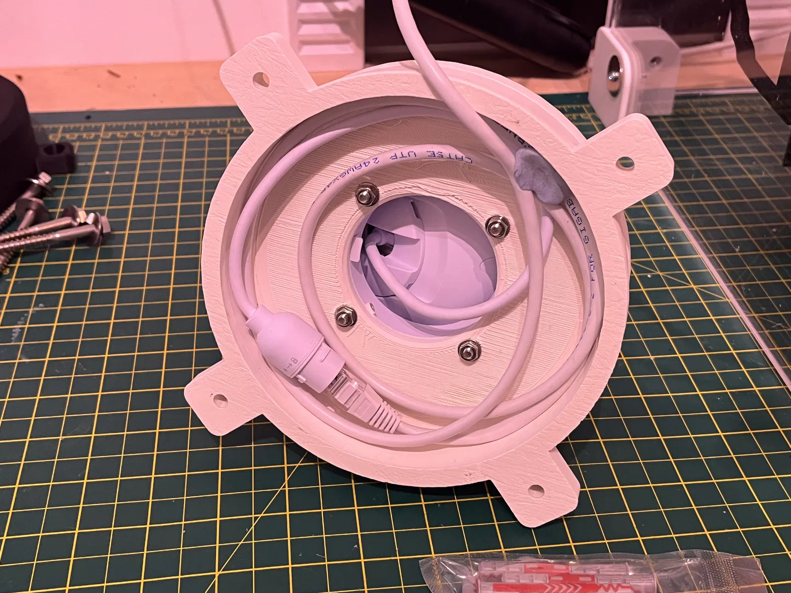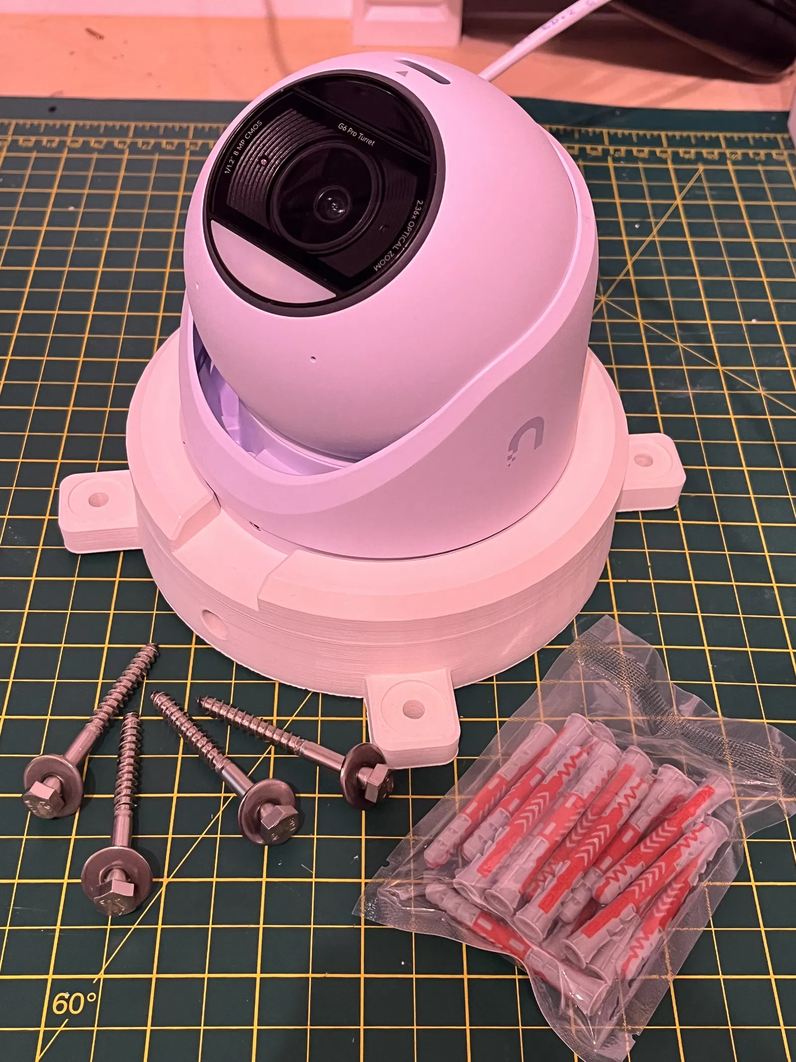 Camera Ubiquiti Unifi G6 Pro Turret PoE CCTV có thể được bắt vít vào đế gắn tường này bằng các loại đai ốc và bu lông M4. Sau đó, đế in 3D lớn hơn có thể được bắt vít vào tường ngoài trời bằng bu lông M6 với vòng đệm 18mm và một số neo tường gạch phù hợp.