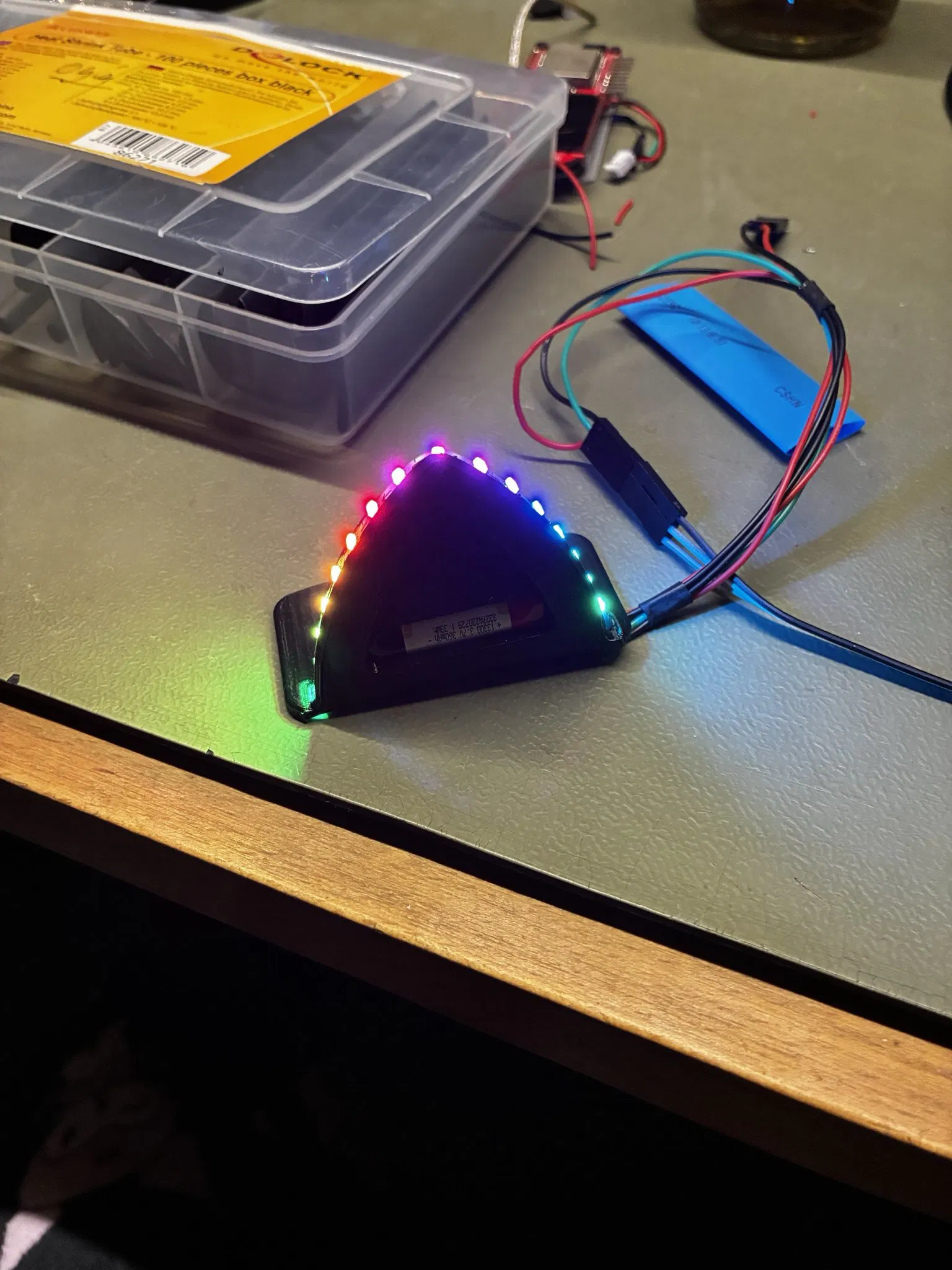 Hiện tại con ESP với WLED chạy nóng quá trời (60 độ C) và điện áp pin (3.7v-4.2v) đi thẳng vào ESP. Với lại không phải tất cả LED đều nhìn thấy rõ từ phía trước.
