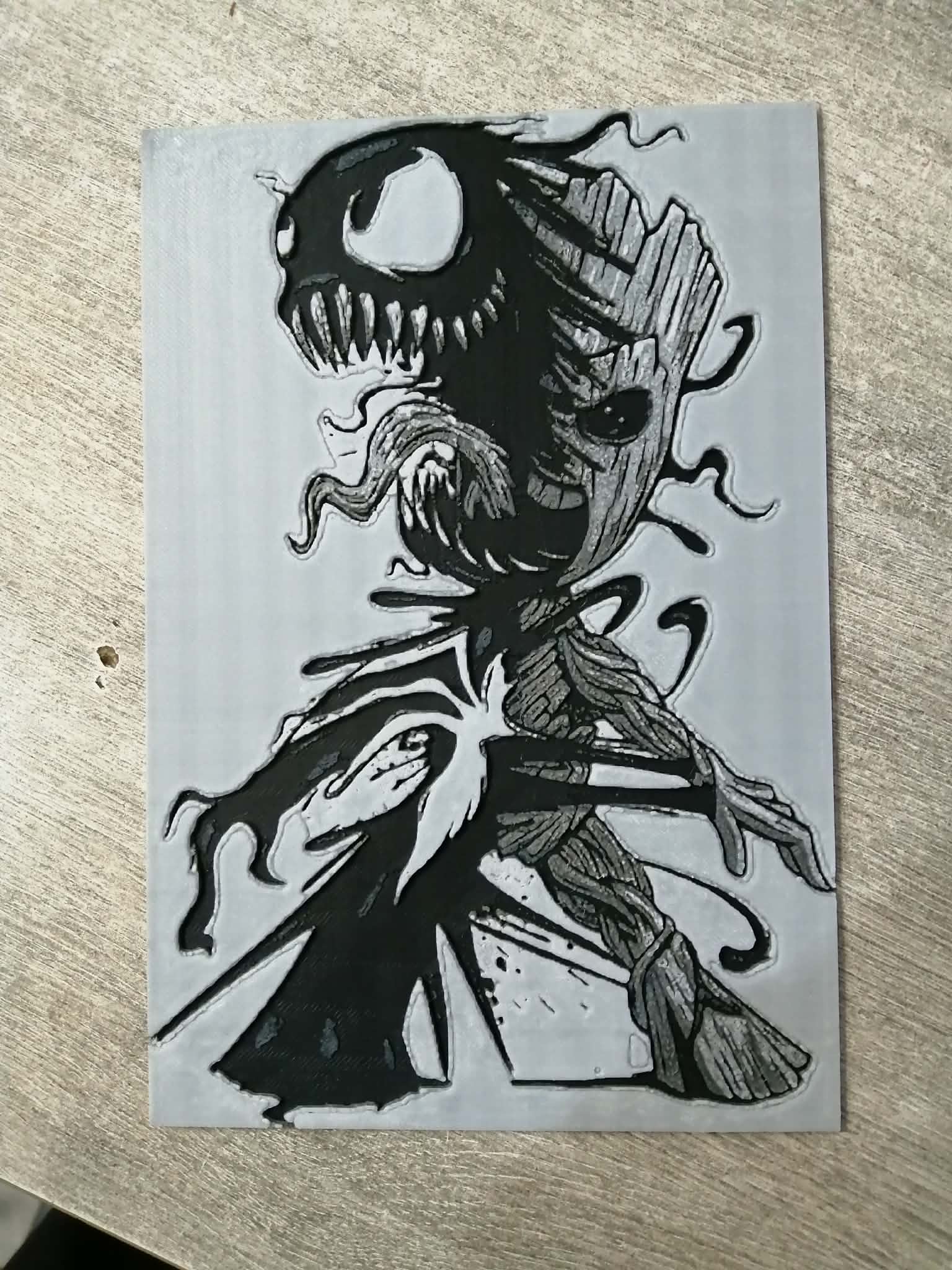 Hộp sọ Groot Venomiser được tạo ra bởi Hue Forge. Hướng dẫn đổi màu chi tiết cho mô hình in 3D này bao gồm các bước đổi từ màu đen sang xanh xám, rồi xám và cuối cùng là trắng.