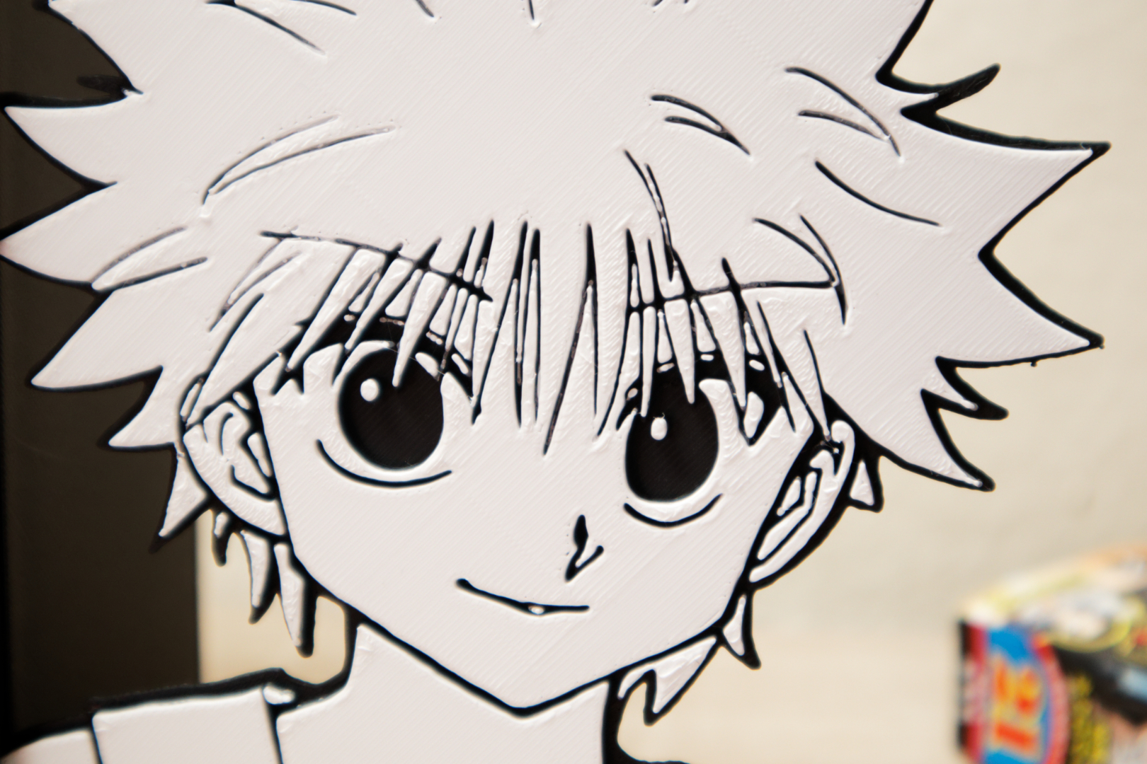 Chặn sách Killua Zoldyck fan art từ Hunter x Hunter, bao gồm tượng và đế. Thông tin chi tiết về kích thước, trọng lượng, cài đặt in và các lựa chọn màu sắc cho bản in 3D. Hướng dẫn dán và tùy chọn đặt trái/phải. Không được bán lại.