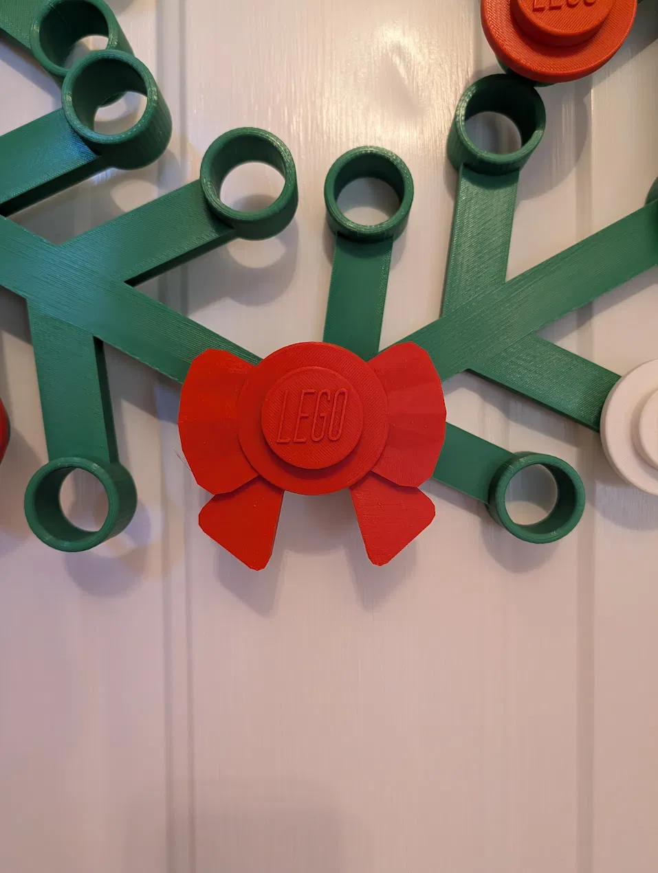 Một chiếc nơ Lego có cục stud Lego ở giữa. Tác giả muốn một chiếc nơ không có hình trái tim, thay bằng cục stud Lego từ vòng nguyệt quế của Fuganter, kích cỡ cho vòng nguyệt quế in 200%.