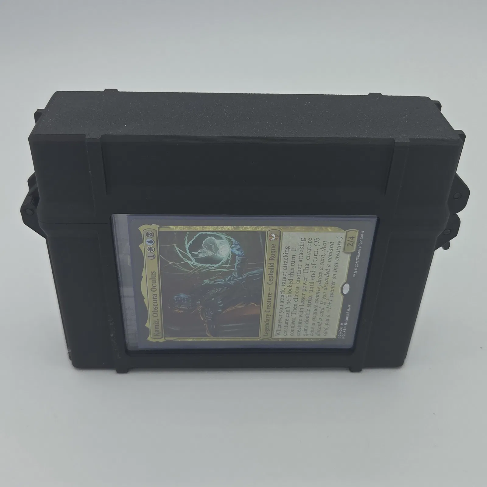 Dựa trên mẫu Rugged Parametric Box của Whity, tui đã chỉnh sửa lại cho vừa một bộ bài Commander 100 lá có bọc (cộng thêm lá token). Chia đôi ra thì lá bài nằm gọn trong mỗi nửa, còn lá bài Commander thì có thể để ở mặt trước "cửa sổ" với top loader.