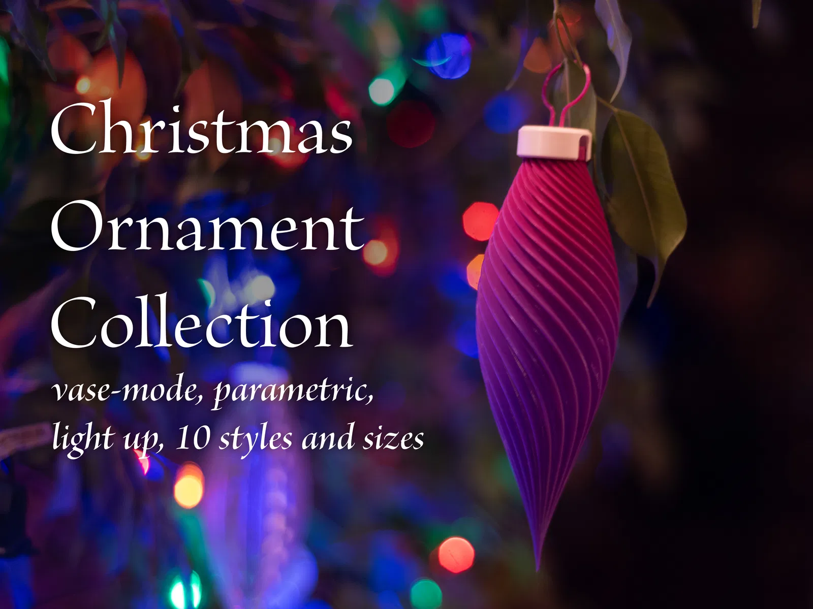 Khám phá bộ sưu tập 10 món đồ trang trí Giáng sinh độc đáo, in được bằng chế độ "vase mode" và có thể tùy chỉnh. Có thể treo hoặc kẹp vào đèn để phát sáng. Bao gồm file STL và mã nguồn OpenSCAD. Lưu ý các mẹo in chi tiết để đạt kết quả tốt nhất.