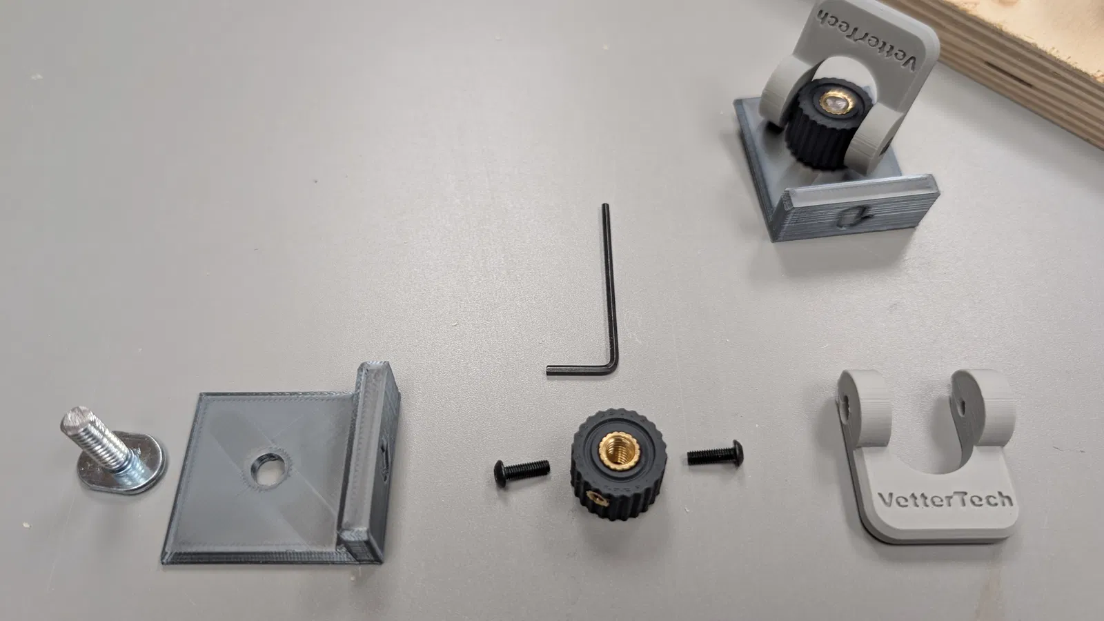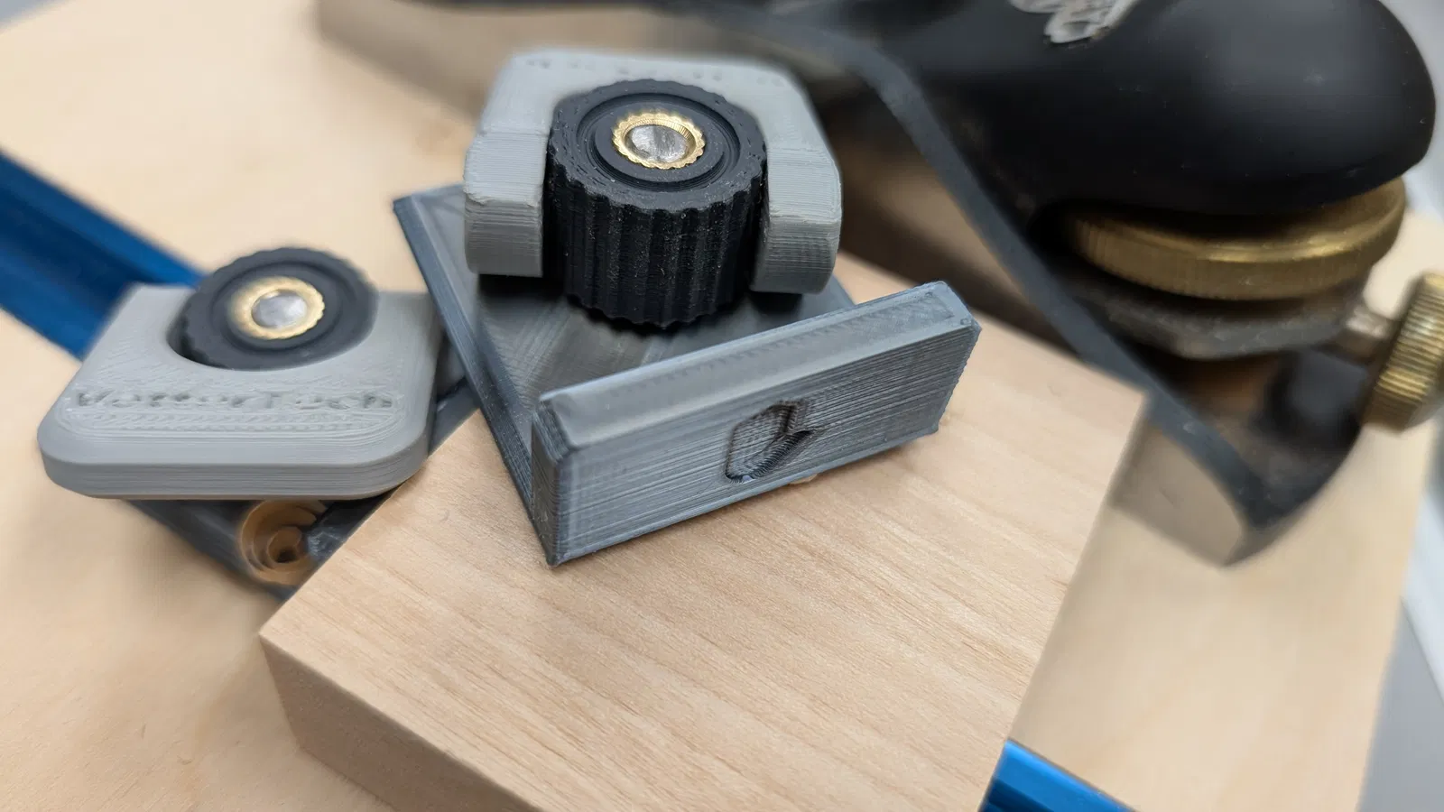 Bộ chặn T-Track có cấu hình thấp, điều chỉnh được này dùng cho rãnh T tiêu chuẩn 3/4". Núm vặn có ốc nhiệt giúp tăng độ bền, kết nối với khóa đòn bẩy bằng ốc mét. Bản cập nhật này sửa lỗi, chuẩn hóa thiết kế và có link mua phụ kiện.