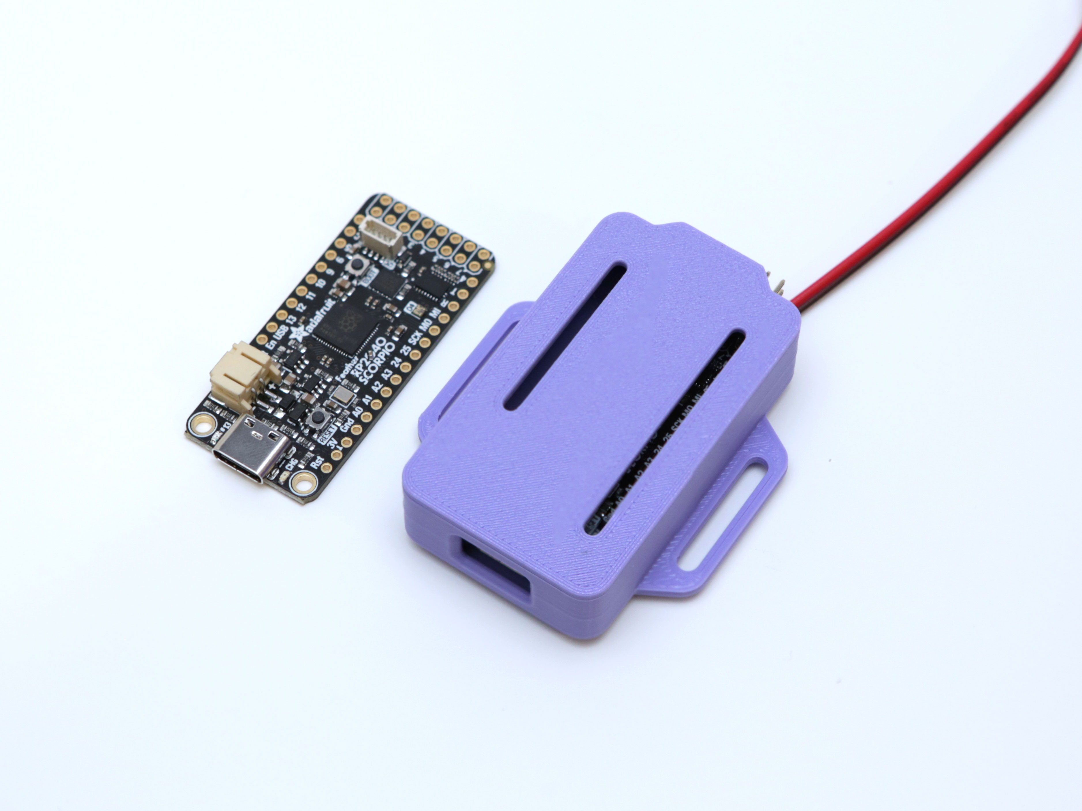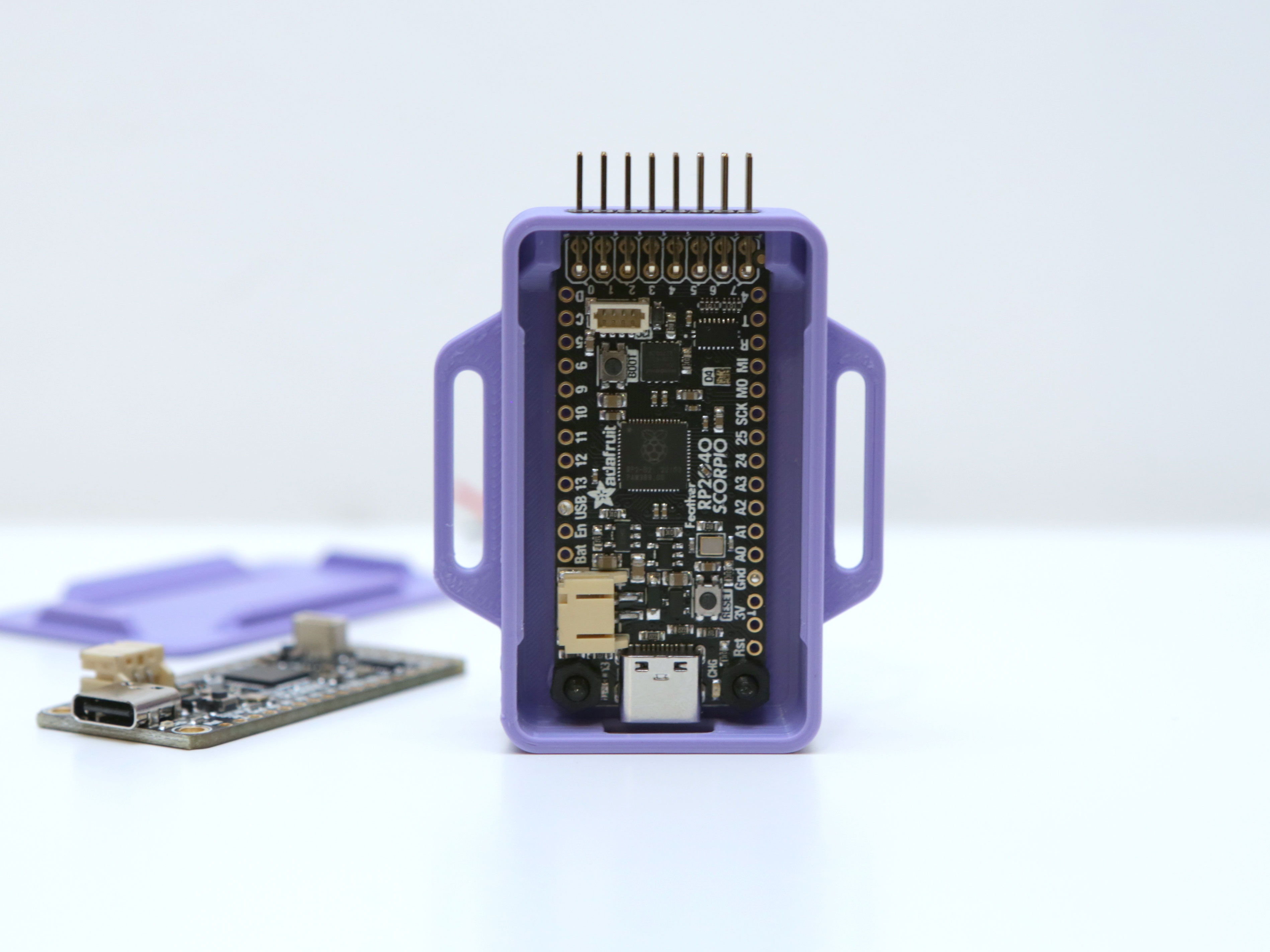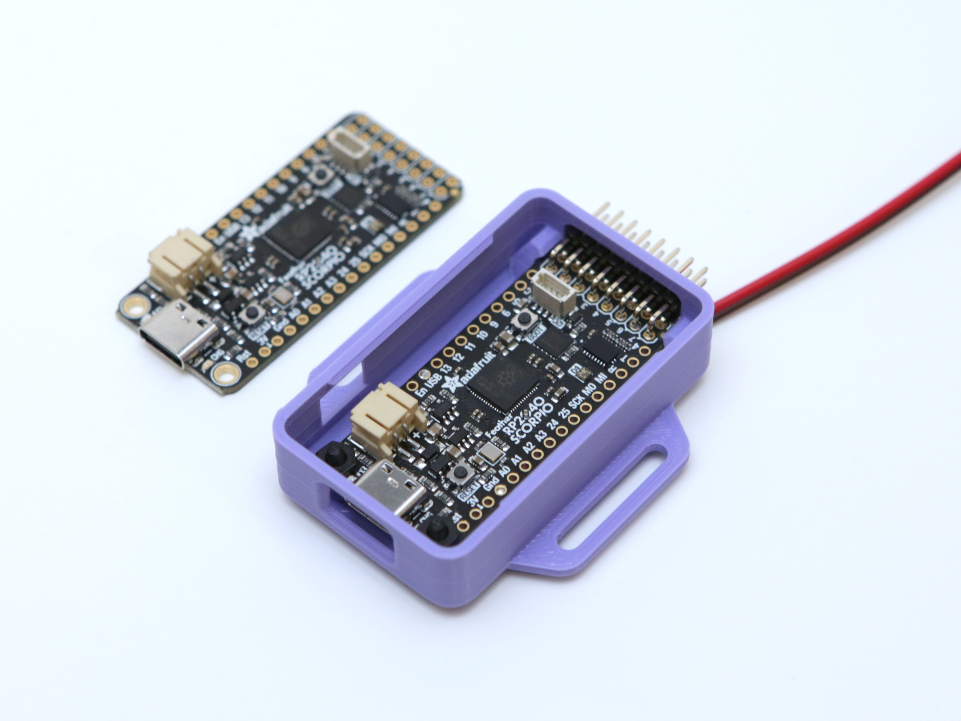 In 3D Print ngay một cái vỏ dạng snap fit cho em Feather RP2040 Scorpio nha! Vỏ này có sẵn các rãnh gài và lỗ mở cho cổng USB, pin, header các kiểu luôn!