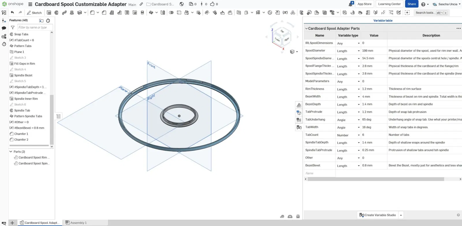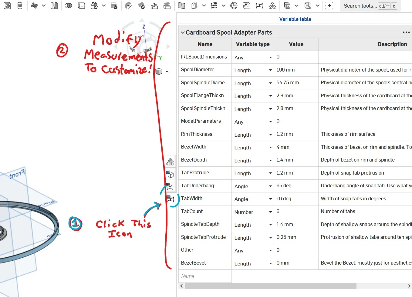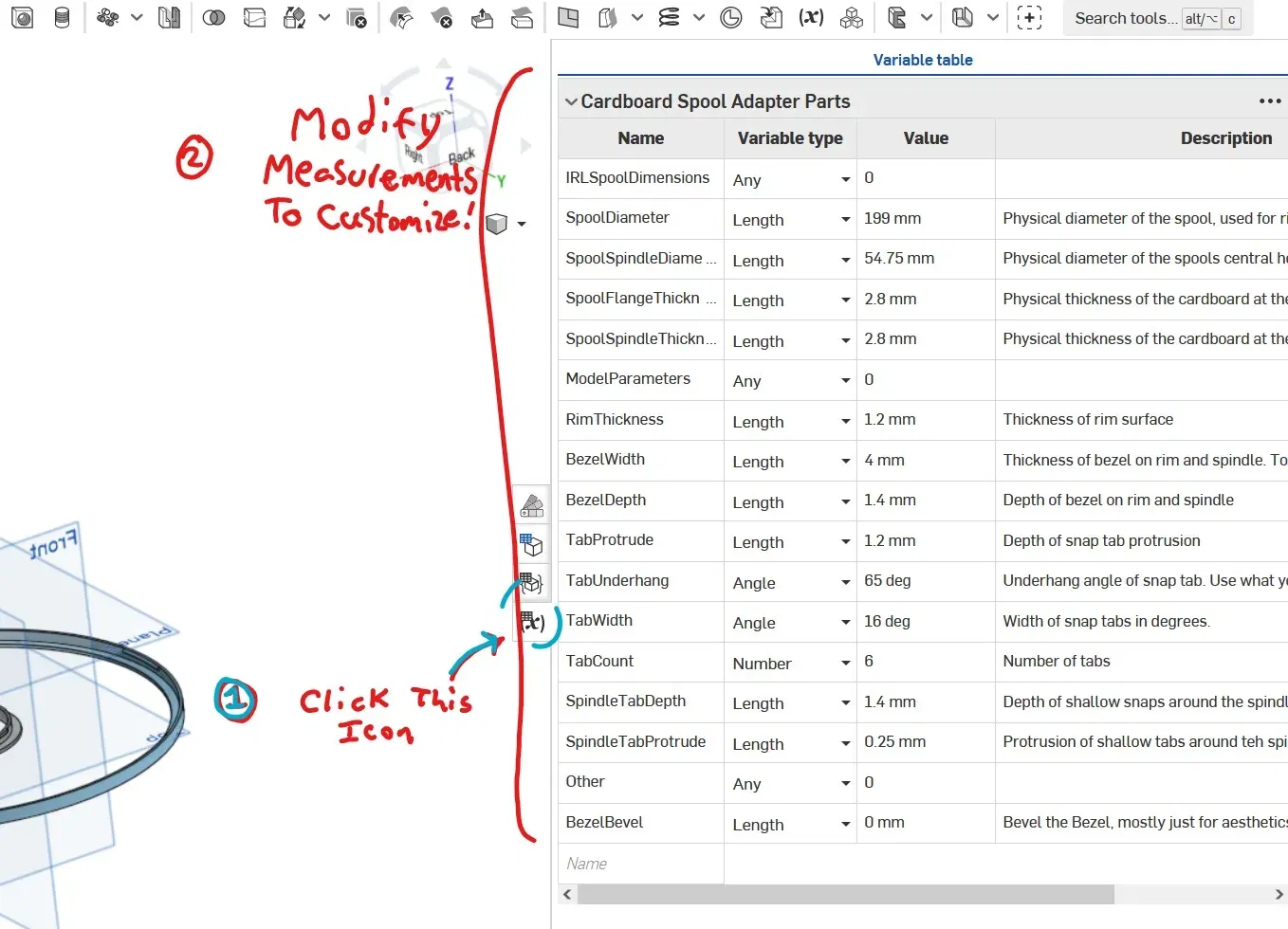 Việc sửa đổi các giá trị trong bảng biến có thể tạo ra một vành phù hợp với bất kỳ cuộn nào. Bạn sẽ cần một tài khoản Onshape; Khi bạn đăng nhập, một tùy chọn để “tạo một bản sao” sẽ xuất hiện ở góc. Điều này sẽ cho phép bạn sửa đổi một bản sao để phù hợp với nhu cầu của bạn.