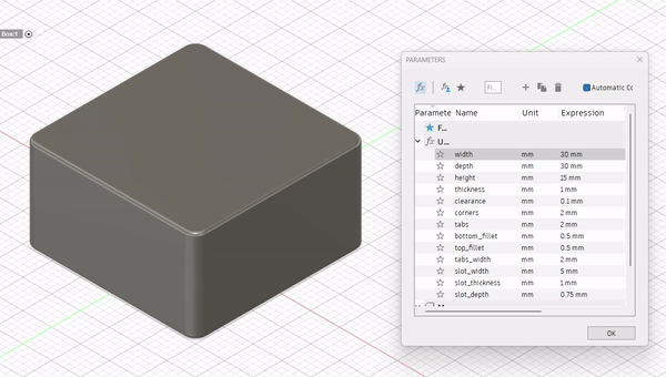 Phiên bản 2. Hộp tùy chỉnh (Parametric Box). Bạn có thể tùy chỉnh kích thước theo ý muốn. Nếu không có Fusion 360, cứ cho tôi biết bạn muốn gì và tôi sẽ tạo mô hình cho bạn.