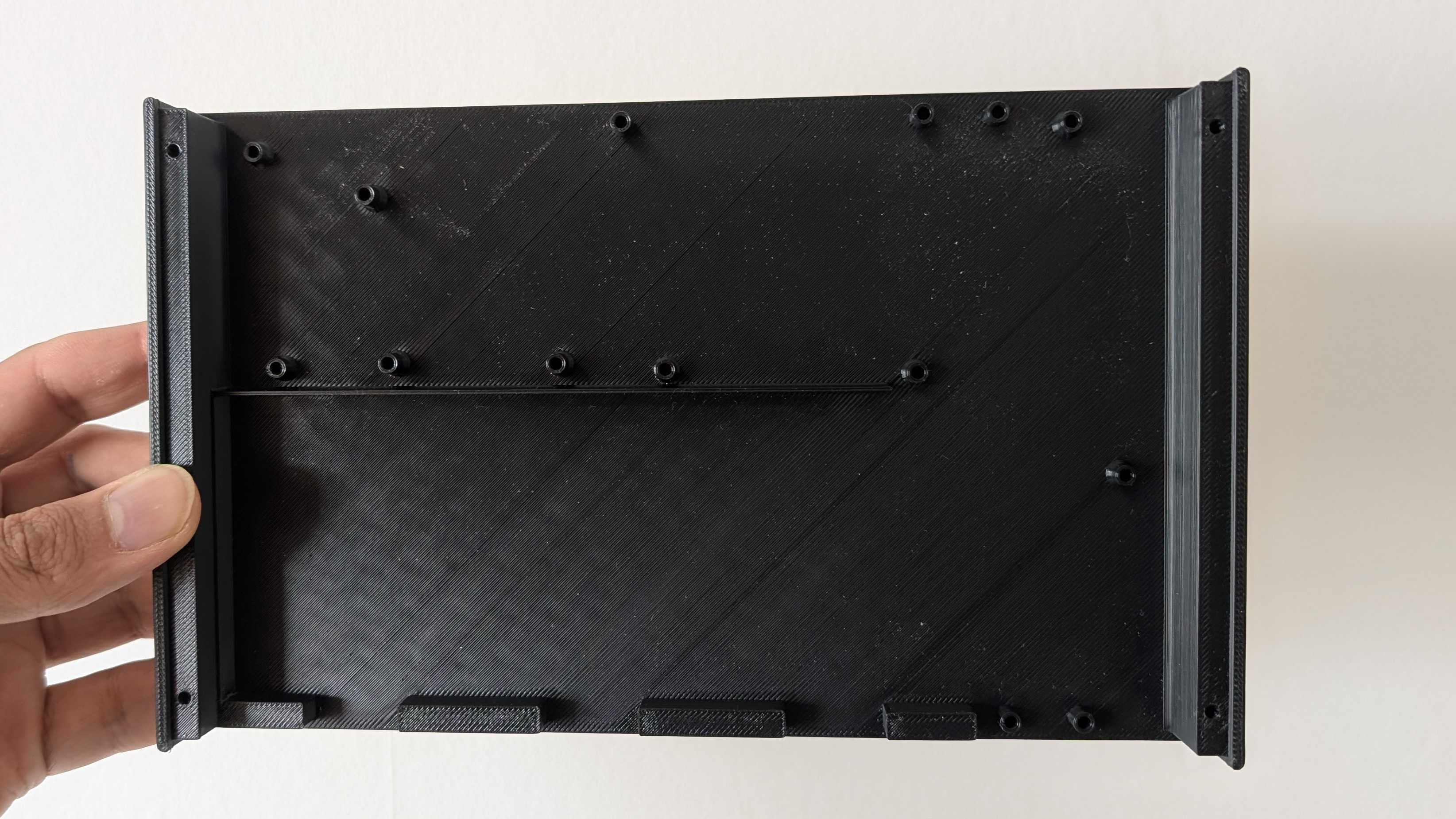 Tấm Mặt dưới bị cong nên tôi lẽ ra nên thêm một đai ốc ren nữa ở đáy khe pin để phần giữa của tấm Mặt dưới cũng vặn vào Đế, tuy nhiên độ cong không đáng kể khi lắp nắp. Tấm Mặt trên cũng bị cong tương tự nhưng không có nhiều chỗ để thêm đai ốc ren.