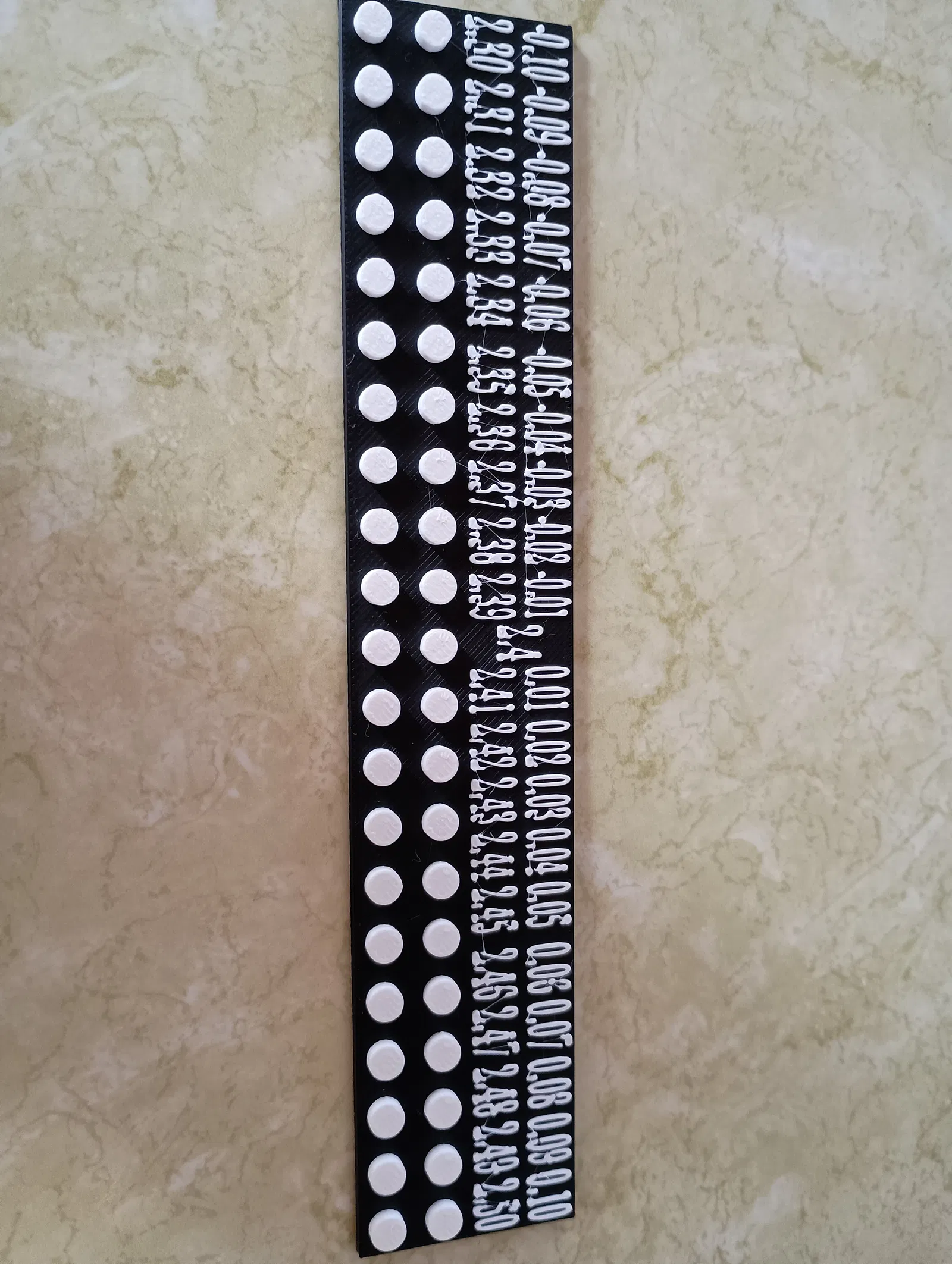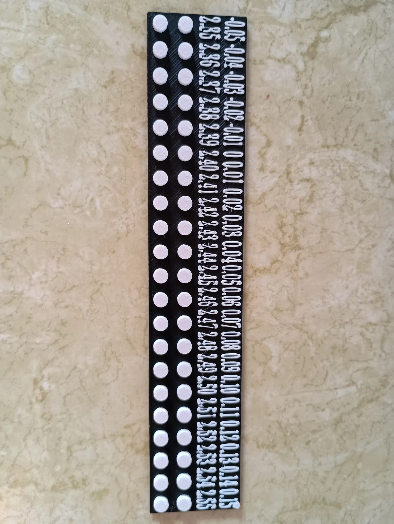 Chiếc tool của tôi khác biệt vì tôi cung cấp cho bạn các núm lớn dần (theo gia số 0.01 mm) để bạn có thể tìm ra phép đo hoàn hảo cho máy in của mình. Không có khái niệm tỷ lệ, mà là bạn sẽ sử dụng kích thước nào khi thiết kế các bộ phận của riêng mình. Chiếc tool có hai hàng, một hàng cho độ lệch khỏi bán kính núm bình thường, và hàng còn lại cho bạn biết phép đo bán kính núm (tính bằng mm). Tôi có hai hàng núm, và hai hàng này giống hệt nhau. Tôi tin rằng việc cung cấp cho bạn hai núm giống hệt nhau sẽ cho bạn một bài kiểm tra tốt hơn, chính xác hơn về kích thước núm nào là tốt nhất. Điều này có nghĩa là khi bạn sử dụng chiếc tool này, mảnh kiểm tra lý tưởng (tốt nhất là một mảnh Lego thật, chính hãng) nên là 1 x X, trong đó X cần ít nhất là hai (nhưng 4+ là tốt nhất). Các con số trên chiếc tool thẳng hàng với một cặp núm, vì vậy khi bạn tìm thấy cặp núm phù hợp nhất, hãy tham khảo các con số phía trên để có được phép đo hoàn hảo để điều chỉnh vào mẫu của bạn. Luôn bắt đầu với các phép đo nhỏ hơn và từ từ tăng dần. Nếu bạn bắt đầu quá lớn, bạn có thể làm kẹt khối.