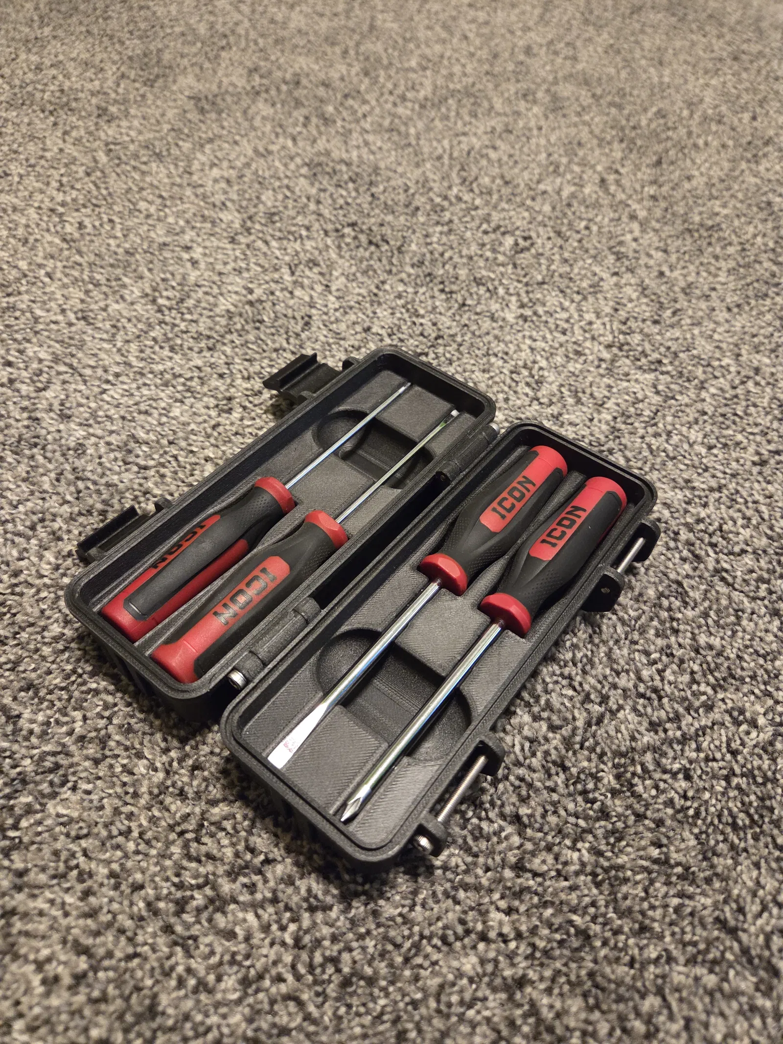 Vỏ cứng cáp cho bộ tua vít mini chuyên nghiệp 4 món Icon của Harbor Freight. Tua vít gài vào vị trí, có thể hơi khó gài lúc đầu. Dùng 6 vít M3x30. In 2 lẫy và 1 cái cho các bộ phận còn lại.