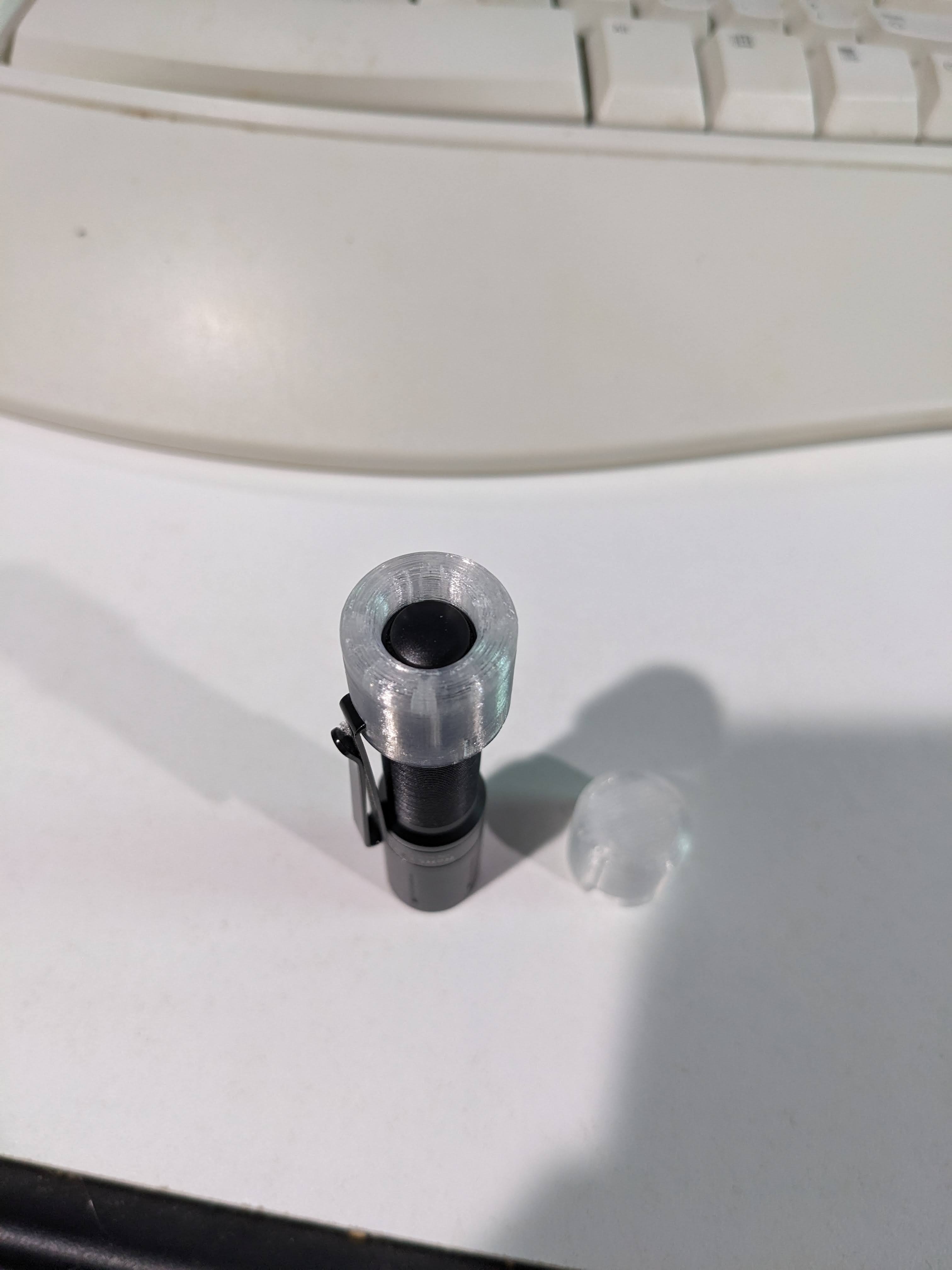 Bị cái đèn pin nó cứ tự bật lên trong túi hoài nên tui làm cái nắp chụp nút này nè. Có 2 loại: một cái là nắp liền, xài thì phải tháo ra mới bật đèn được. Còn cái kia thì có cái viền nhô lên quanh nút. Mấy cái nắp này chỉ cần trượt vô đầu đèn pin rồi xoay nhẹ là nó khóa lại. Có một cái lẫy nhỏ trượt xuống dưới phần kẹp thắt lưng, giúp nắp không bị tuột ra trừ khi xoay nó.