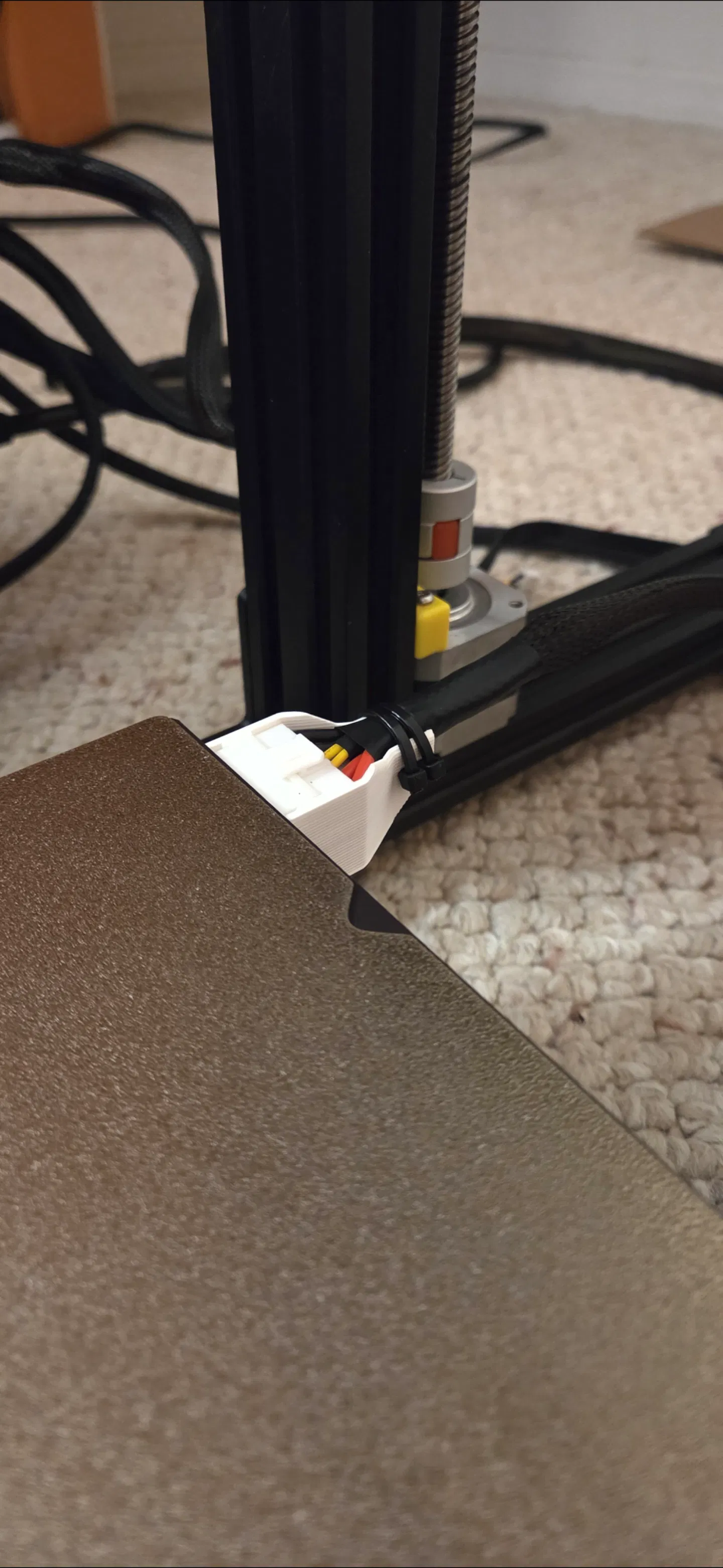 Phần này thay thế bộ phận giảm căng cáp zin trên máy in Ender 3D, đặc biệt là CR10, để tương thích với mạch nhiệt 24v và đầu nối JST. Thiết kế lại để hoạt động tốt với mạch 24v, không cần in hỗ trợ và có thể in bằng PLA. Có phiên bản đặc biệt cho bộ đế silicon.