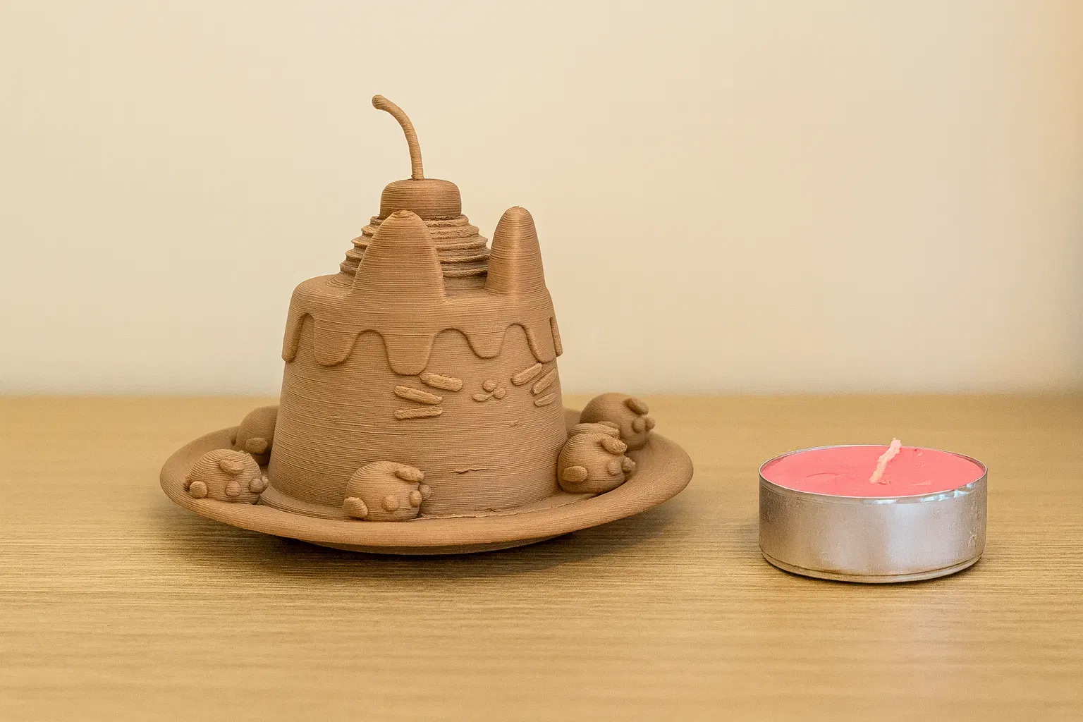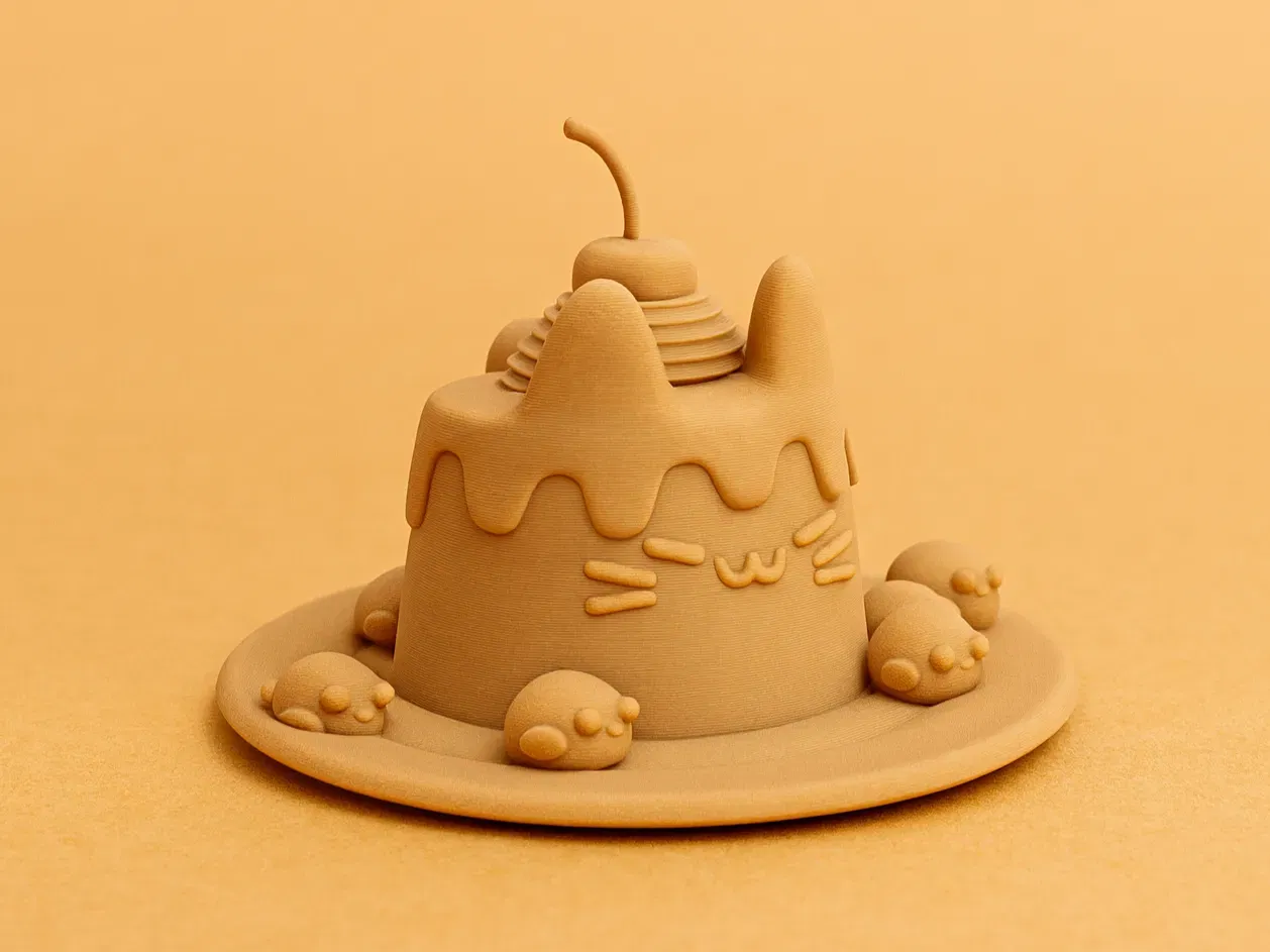 Món pudding nhỏ xinh với tai mèo và bạn chuột tí hon xung quanh đĩa. Vừa dễ thương, vừa độc đáo, thích hợp làm vật trang trí hoặc bạn đồng hành trên bàn làm việc. In bằng PLA, kích thước 80 × 79 × 52 mm.