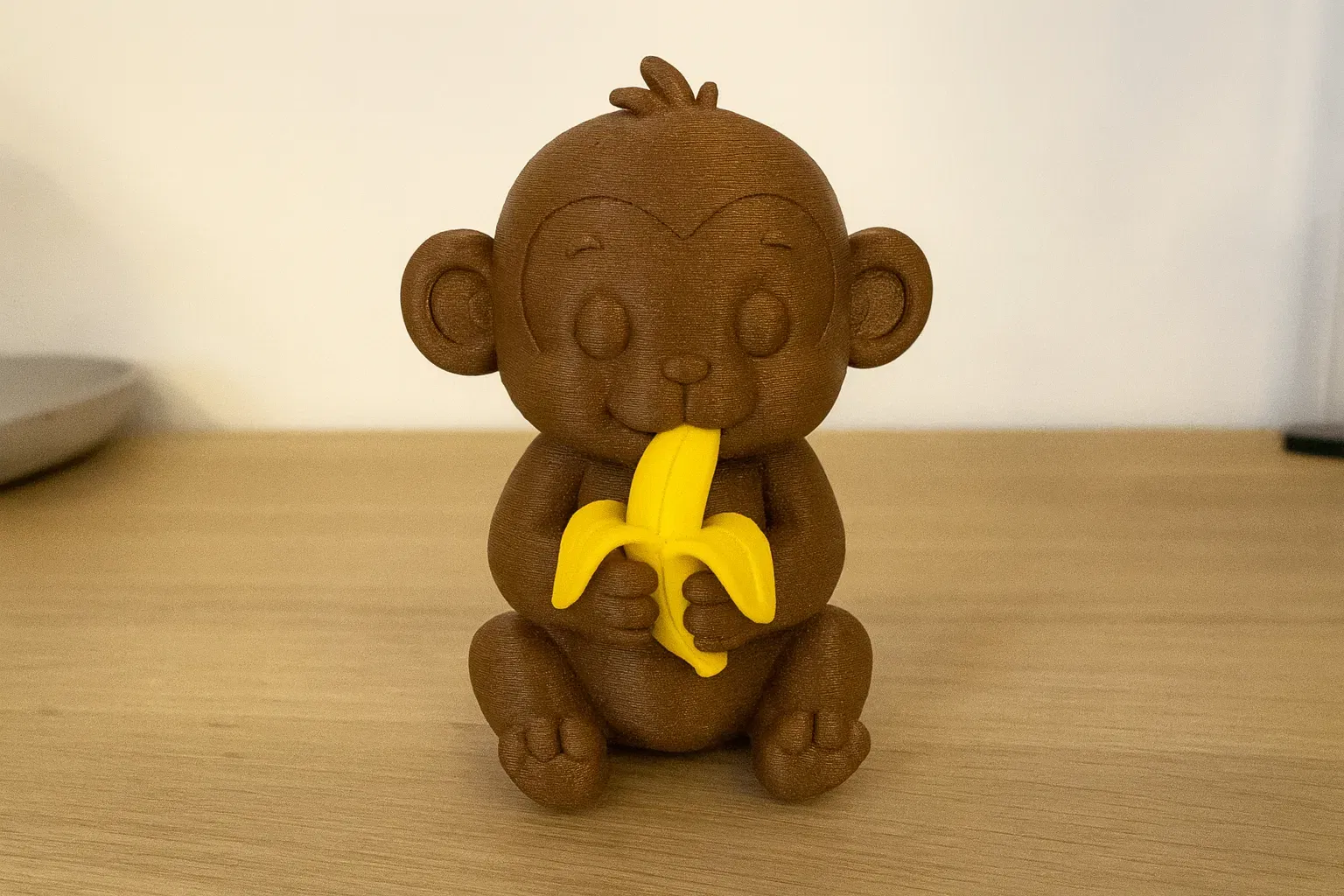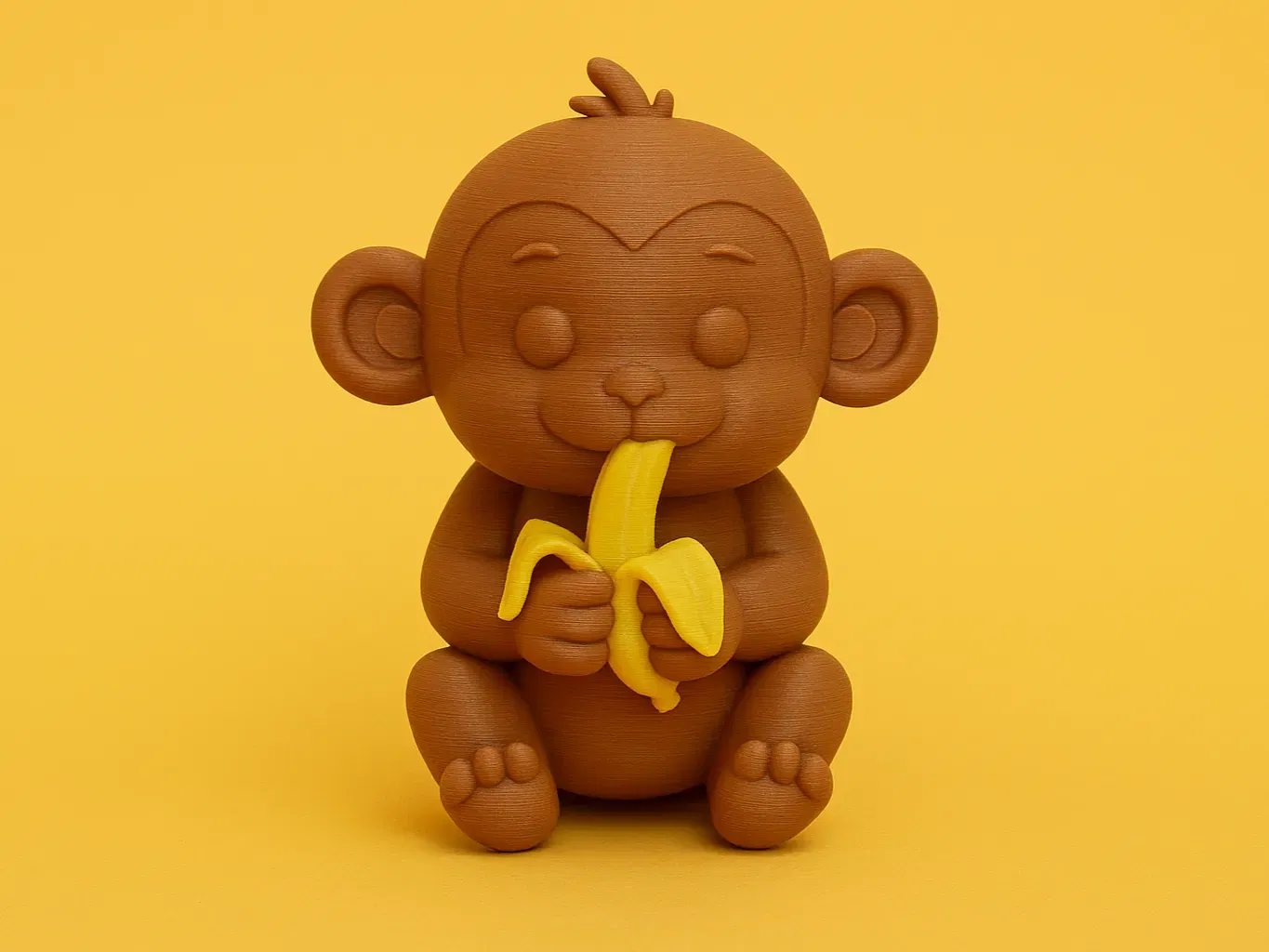 Chú khỉ dễ thương này đang cầm và nhâm nhi quả chuối đã lột vỏ, trông cưng xỉu luôn á. Mình in mẫu này bằng công nghệ đa sắc nên trái chuối nổi bật hẳn lên trên nền thân màu nâu. Kích thước hoàn thiện là 35 × 31 × 45 mm.