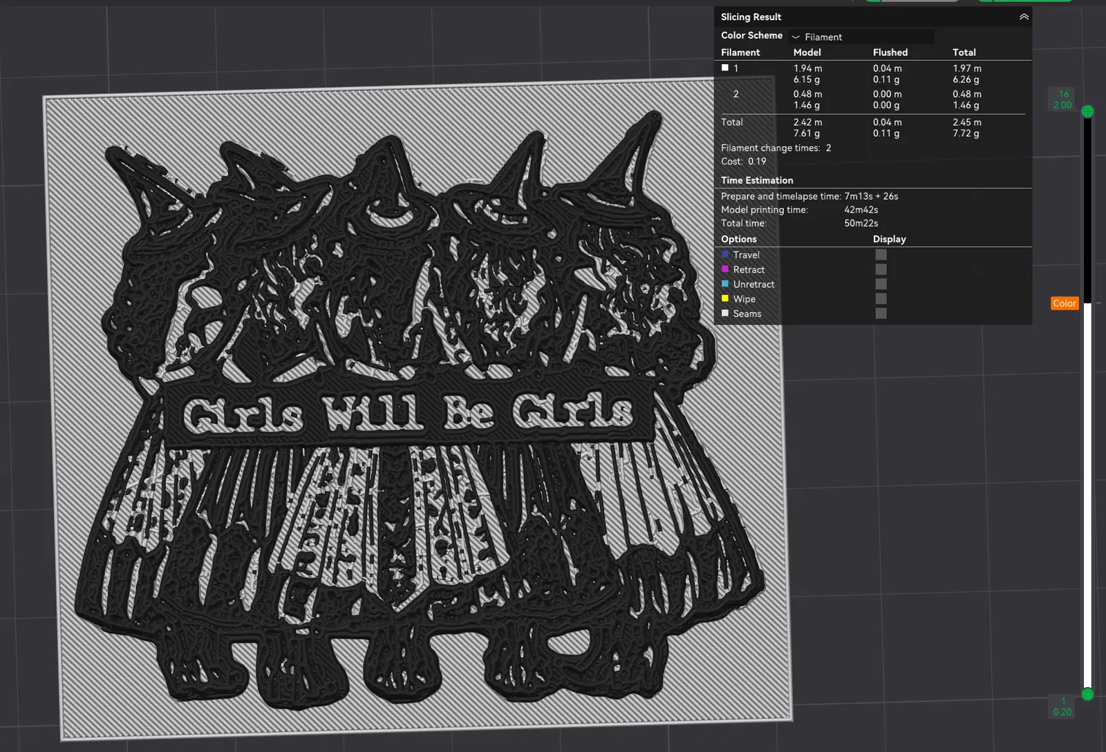 Mô hình "Con gái thì vẫn là con gái" là một ảnh 2D được extrude và remesh lại, với màu sắc đổi một lần ở lớp tương ứng. Có thể điều chỉnh chiều cao lớp in để thay đổi chiều cao của chi tiết. Nên dùng arachne wall-generator và chiều cao lớp in thấp hơn để có chi tiết đẹp nhất.