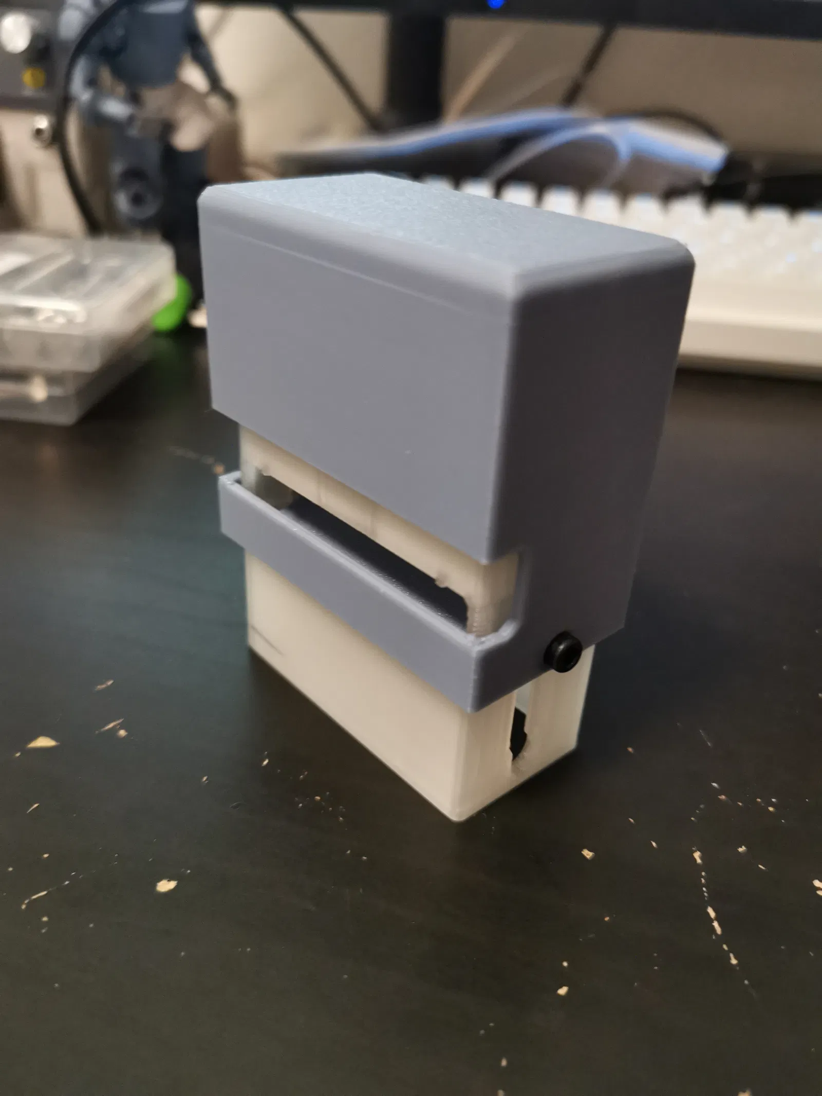Tôi đã sửa lại mô hình và thêm một số thiết kế để chúng ta có thể sử dụng vít để cố định trục xoay giữa vỏ và khay đựng con dấu. Điều này giúp con dấu xoay trơn tru hơn và đáng tin cậy hơn nhiều.