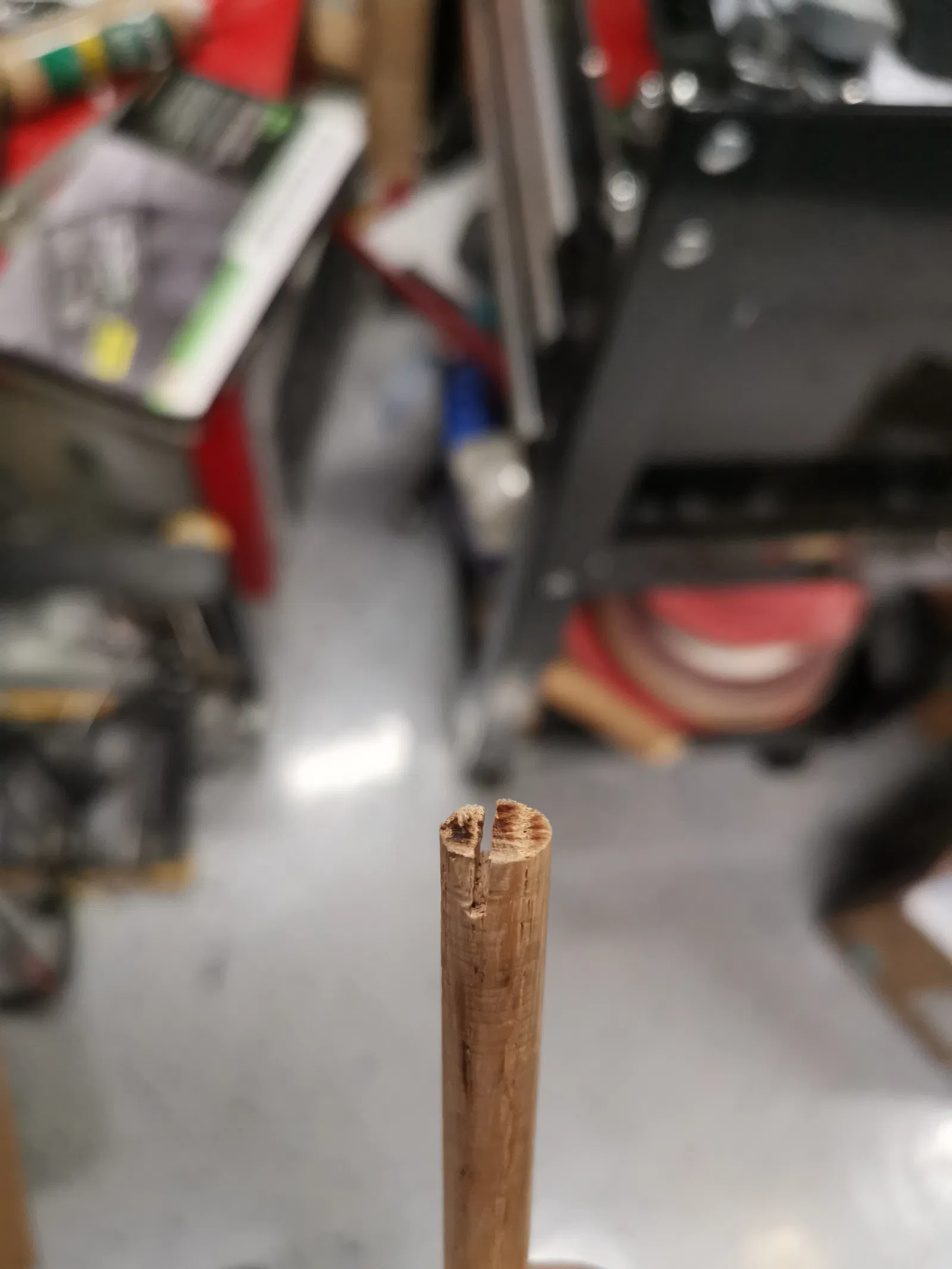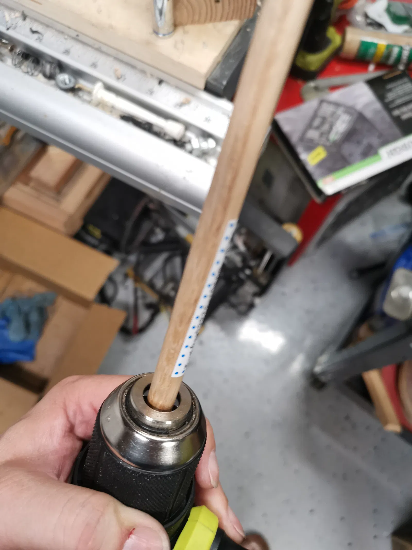 Đặt thanh gỗ vào máy khoan, và luồn một đầu dây đàn piano vào.
